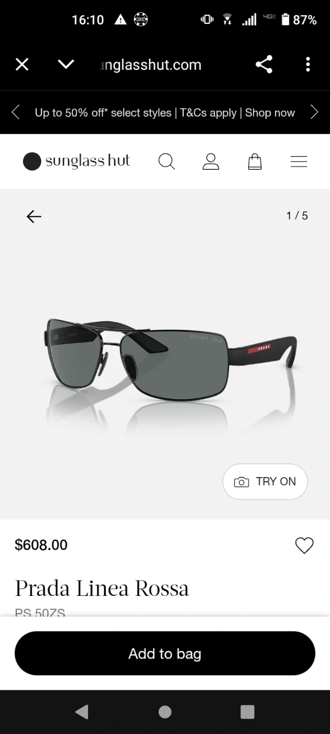 Authentic Prada Linea Rossa PS 507S sunglasses. These shades feature a sleek, dark frame with tinted lenses. The iconic Prada logo is visible on the arm. They offer stylish eye protection.
