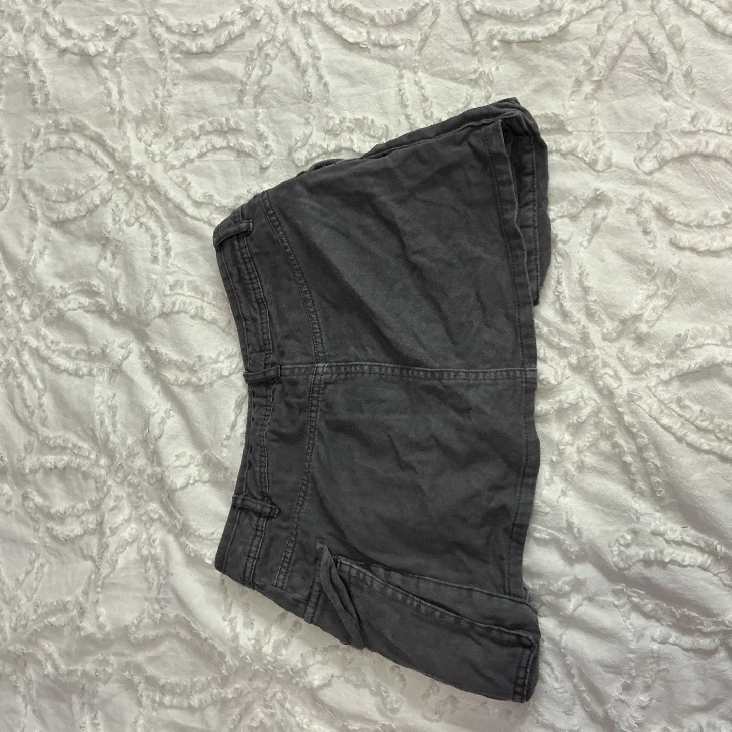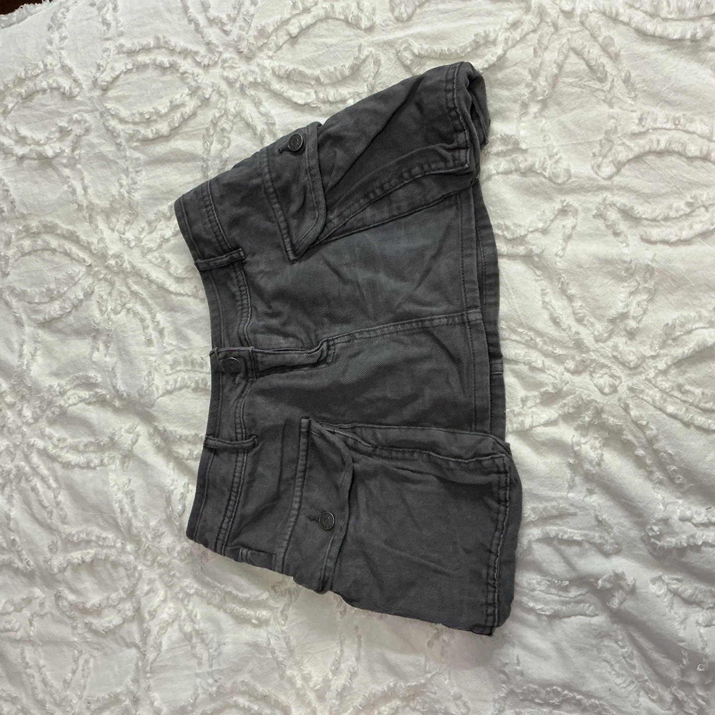 These are charcoal grey cargo skirt. They have multiple pockets with button closures. The material feels like a sturdy cotton blend.wore just once.