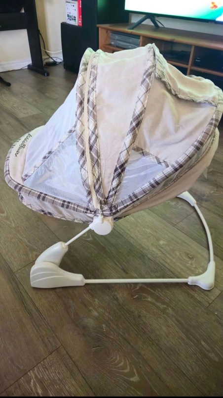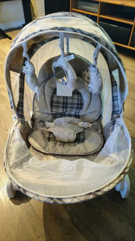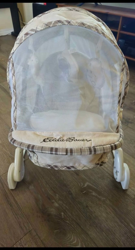 Selling a gently used Eddie Bauer baby bouncer. It comes with a canopy to keep your little one shaded and cozy. It also has some cute hanging toys to keep baby entertained! Perfect for newborns and infants.