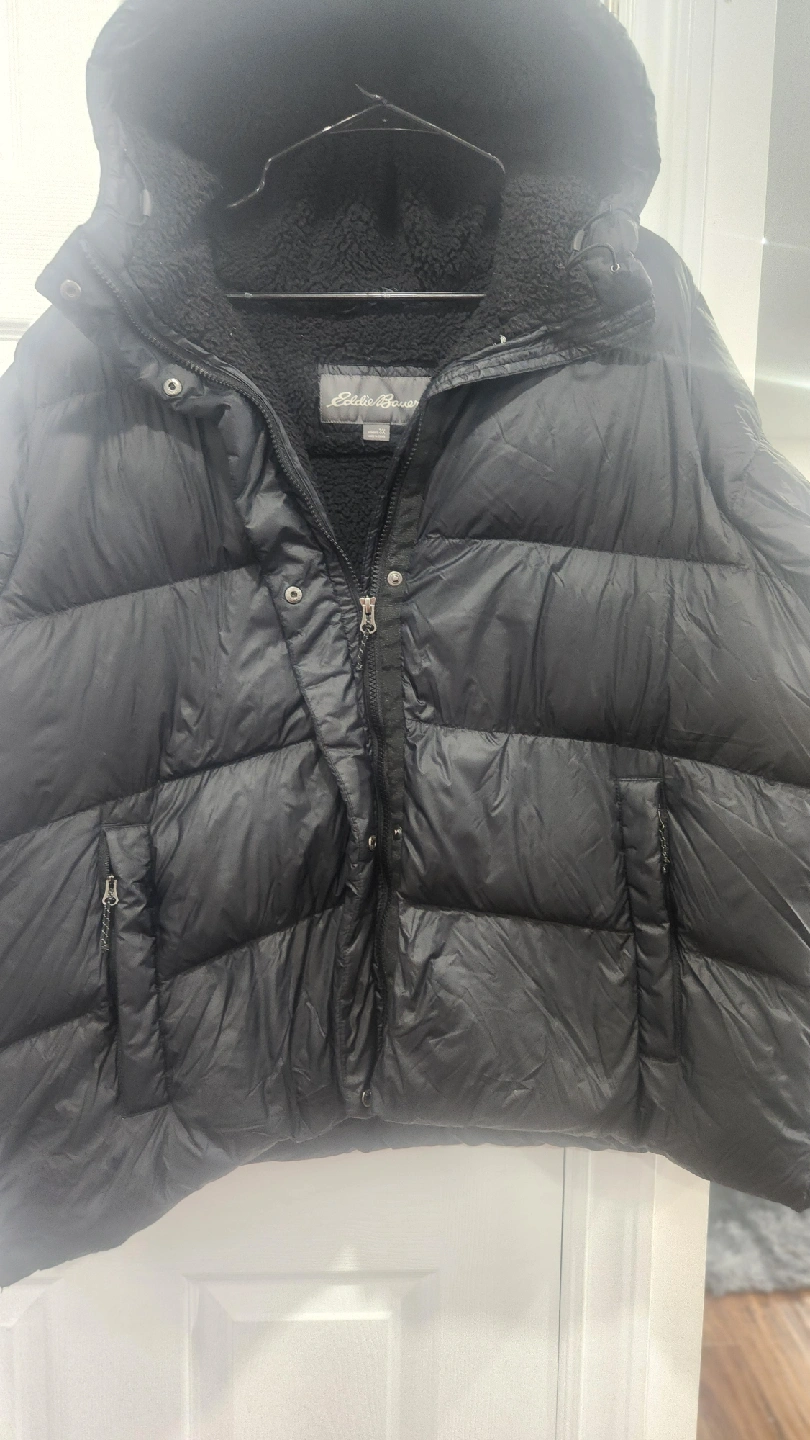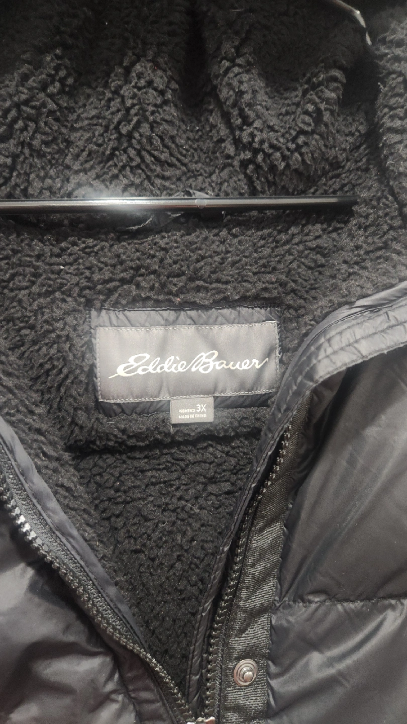 10Cozy Eddie Bauer black puffer jacket in size 3X! It's in great condition and ready to keep you warm this winter. The jacket features a sherpa-lined hood for extra comfort and warmth