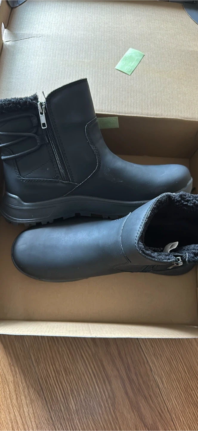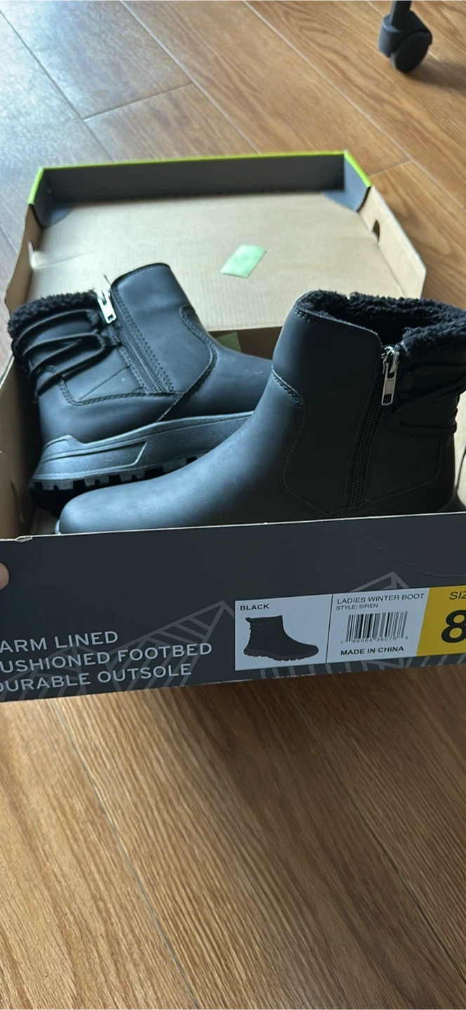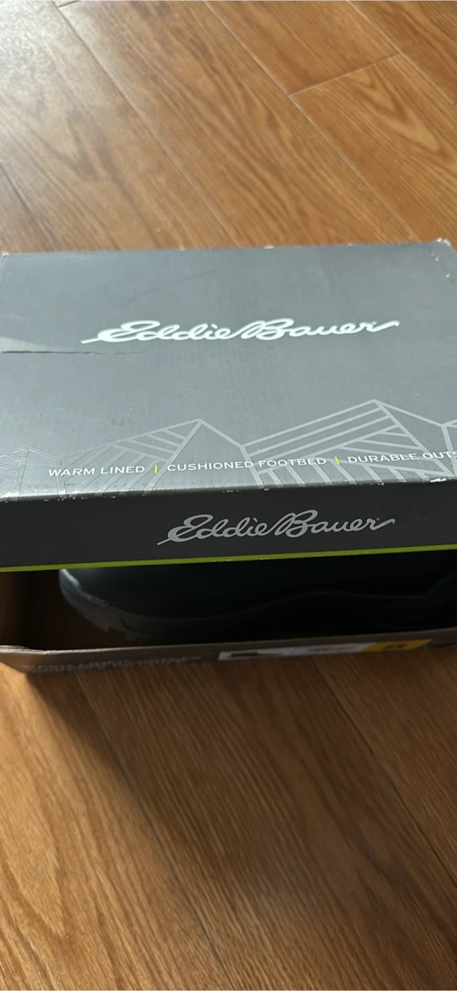 Eddie Bauer ladies winter boots in size 8. The boots are black with a warm lining, cushioned footbed, and durable outsole. Comes with the original box