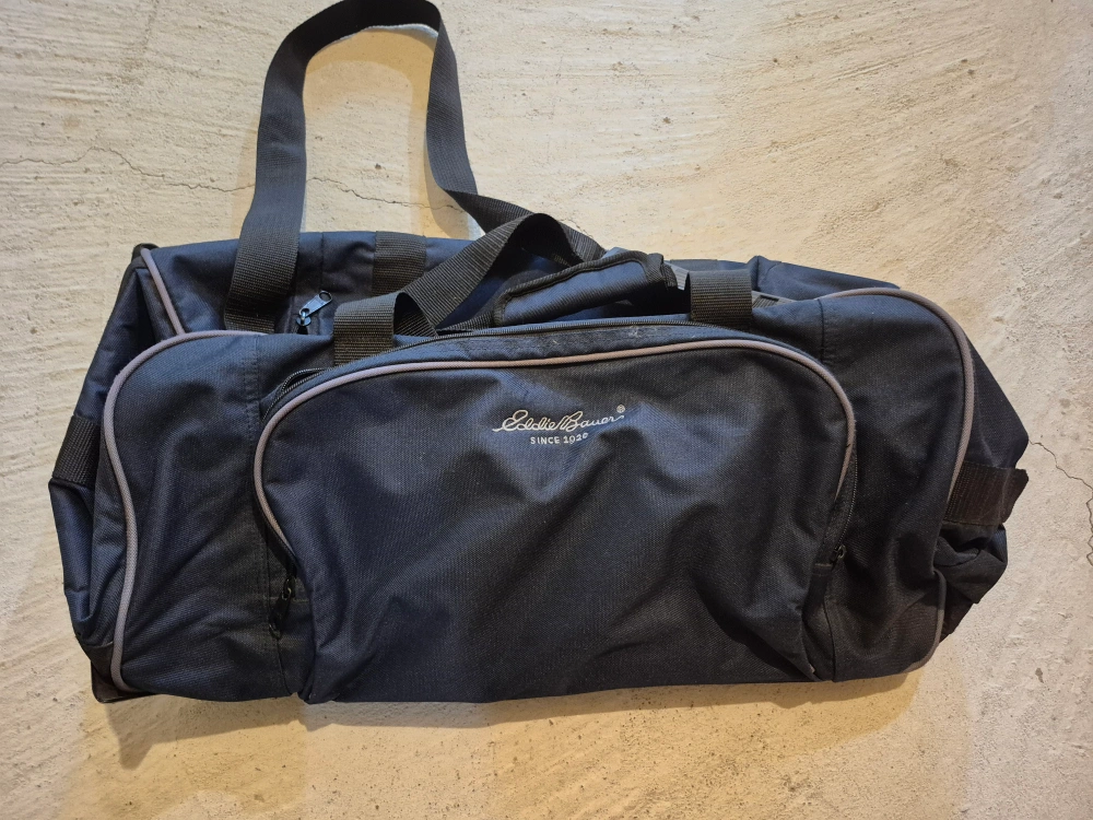 Here's a great Eddie Bauer rolling duffel bag! (with shoulder strap) It's navy blue and in great condition, perfect for travel or the gym.
