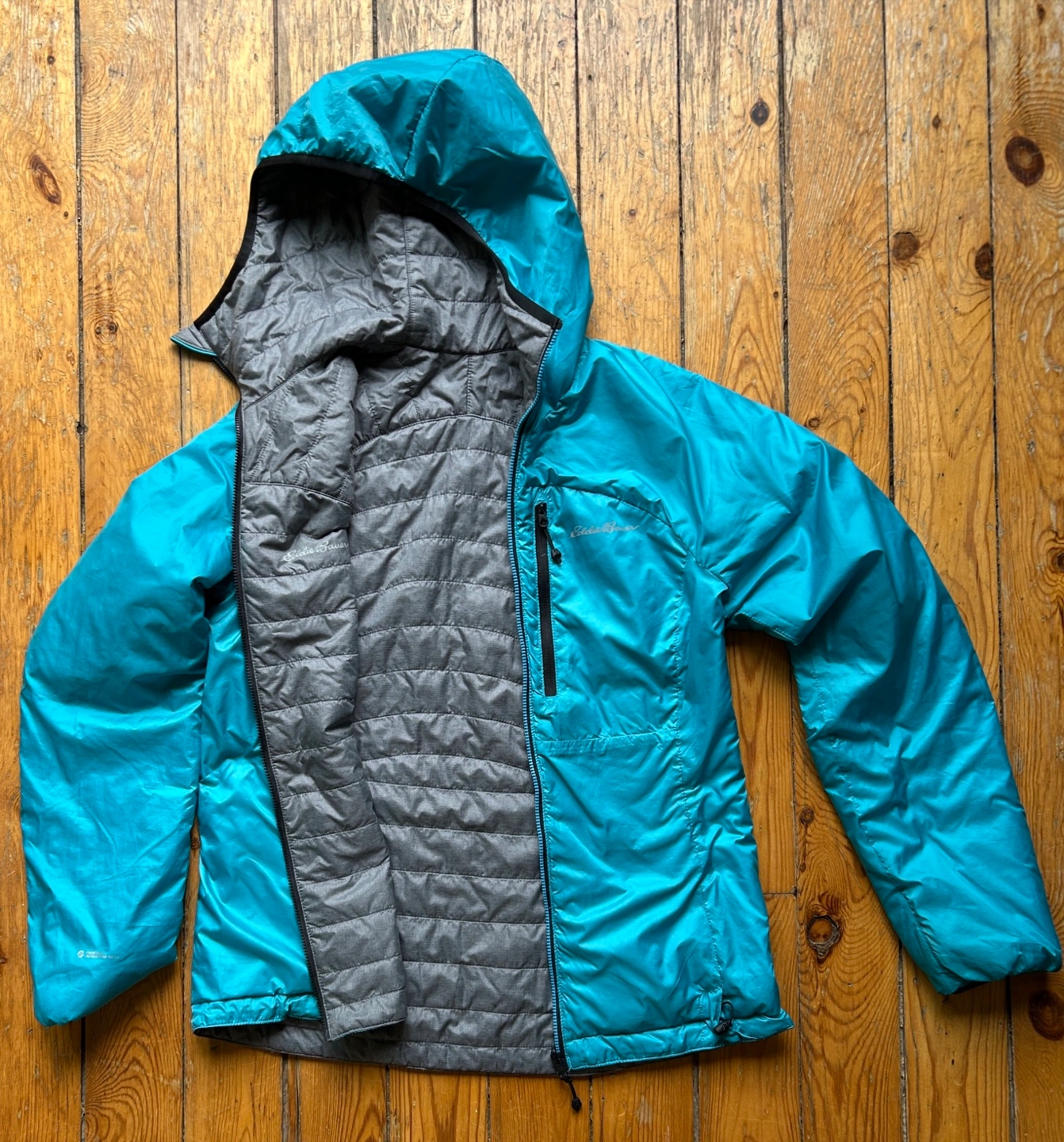 Selling a turquoise Eddie Bauer hooded jacket! It's in great condition and perfect for layering. The jacket features a grey quilted lining and a lightweight design.