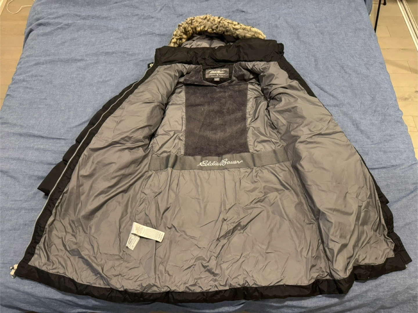 384Selling a gently used Eddie Bauer women's down parka in size medium. It's black and in great condition, ready to keep you warm this winter!
