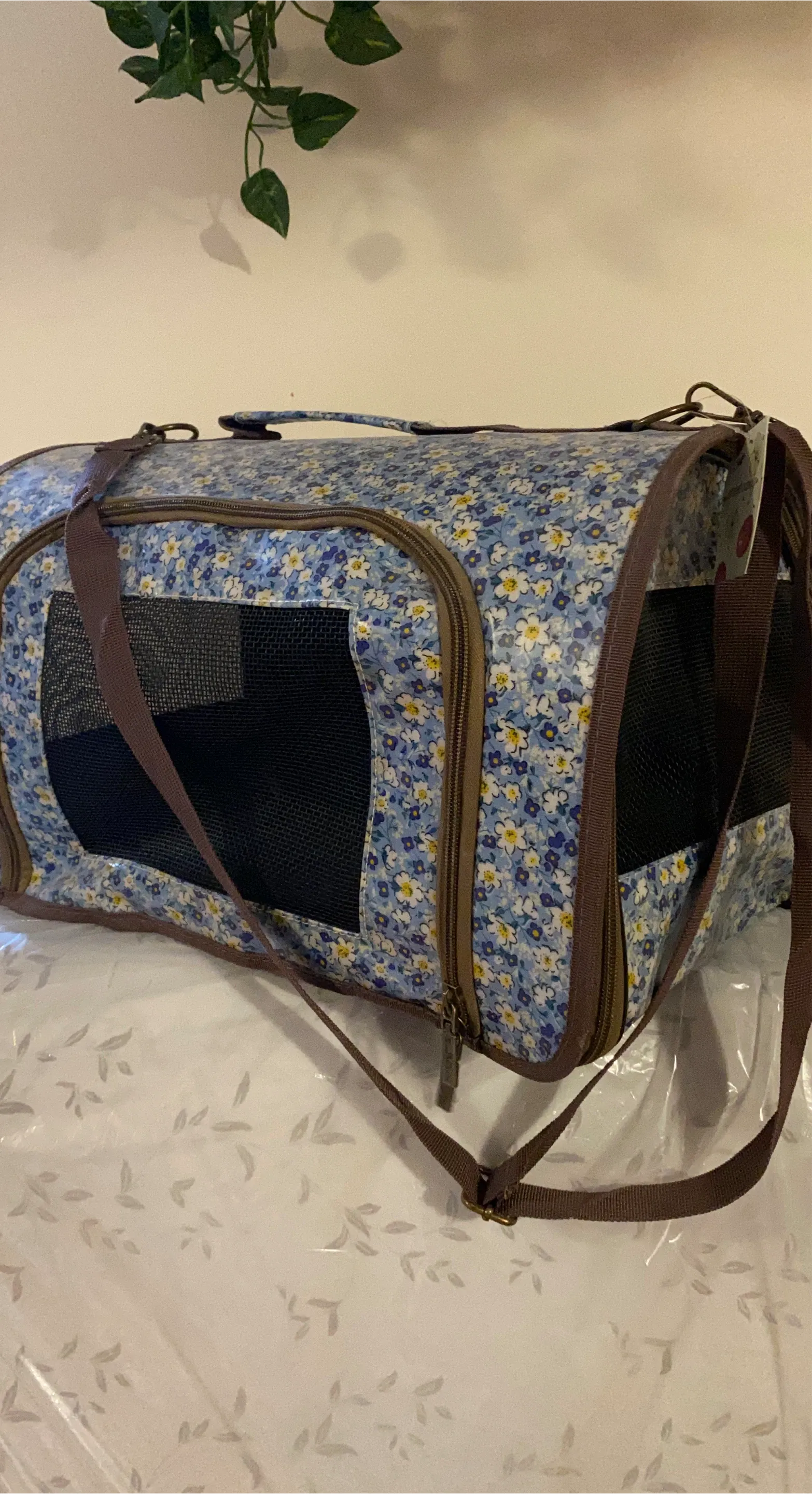 This is a pet carrier bag with a blue floral print. It features mesh ventilation windows on the sides and a zippered closure. Includes a detachable shoulder strap for easy carrying.