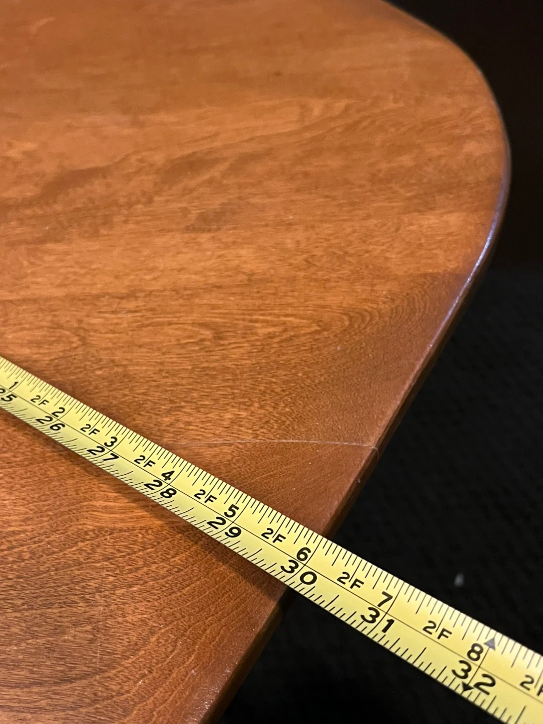 This is a unique wooden coffee table with a distinctive curved design and decorative leg supports. It's made of solid wood with a warm, natural finish. It's suitable for a living room or den. The surface measures approximately 32 inches across.