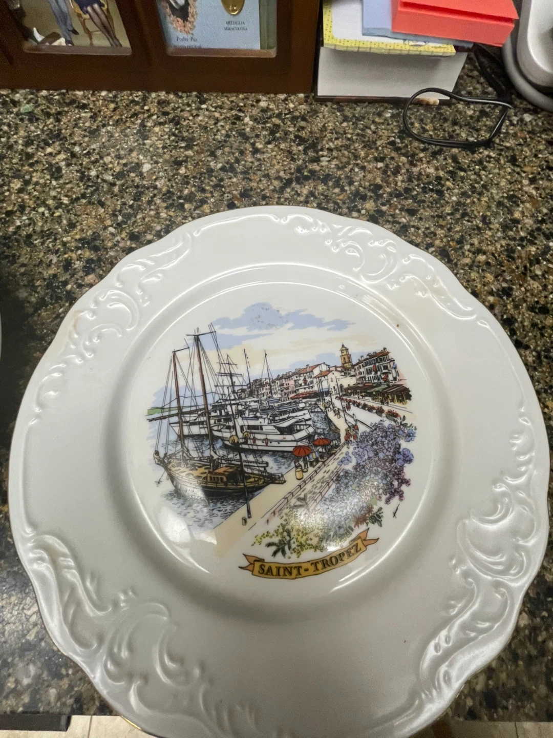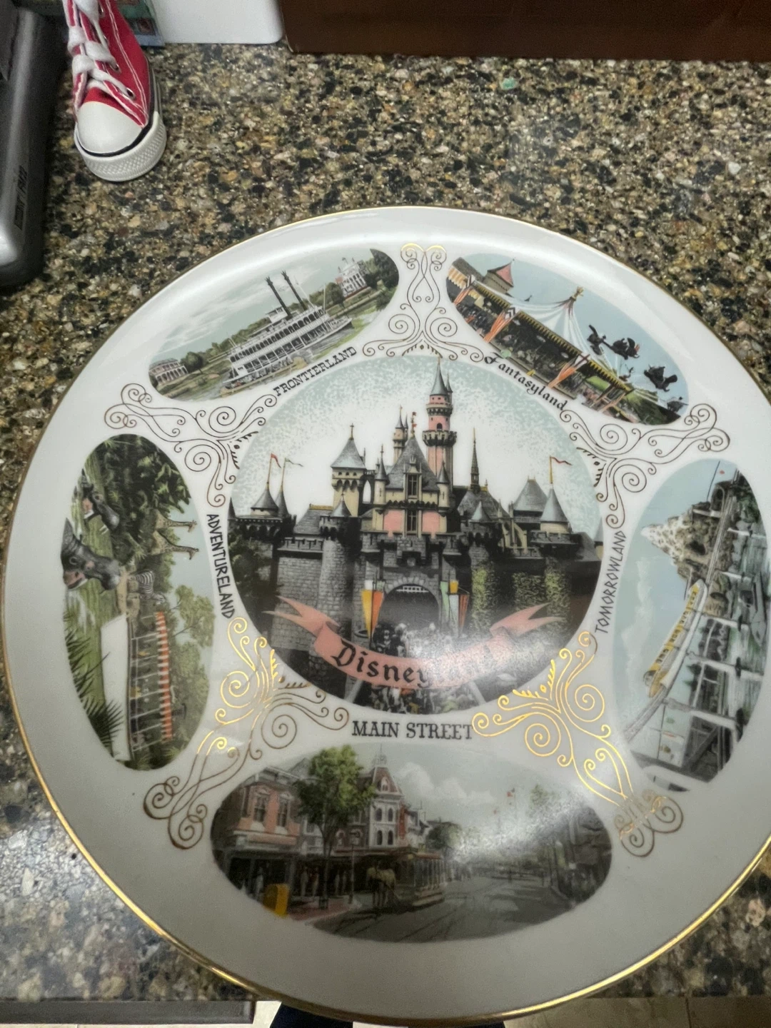 Two decorative plates, one featuring scenes from Disneyland and Main Street and the other depicting Saint-Tropez harbour. Both are white porcelain with decorative gold trim cash only please no e-transfers thank you