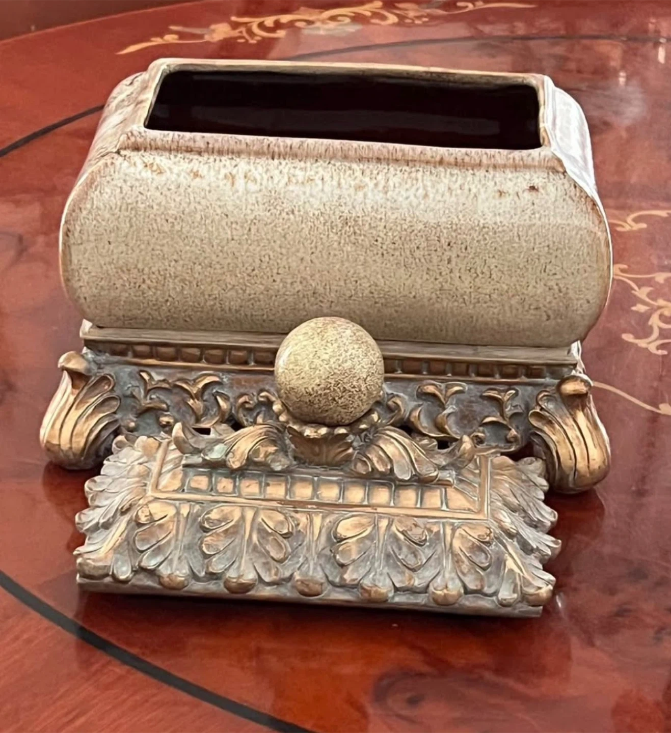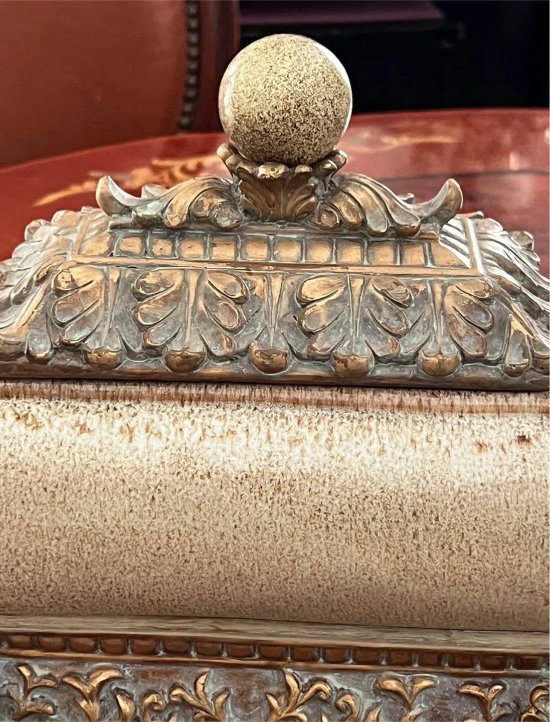 A beautiful decorative trinket box with a lid. It features ornate detailing and a ball finial on top. Perfect for storing small items or as an accent piece.