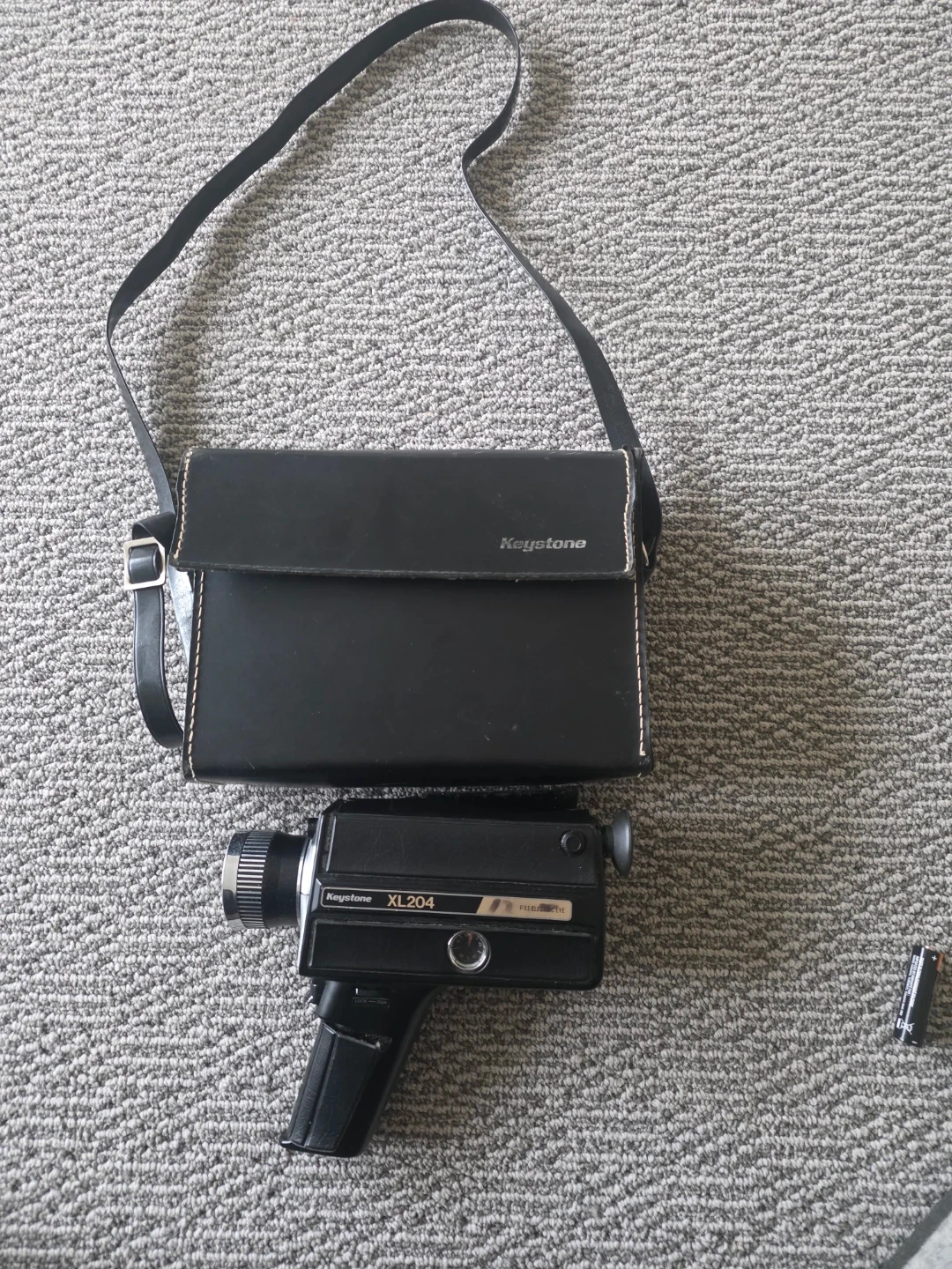 This is a Keystone XL204 Super 8 film camera with an Electric Eye feature. It comes with its original carrying case and a strap. The camera is black and made of plastic and metal.