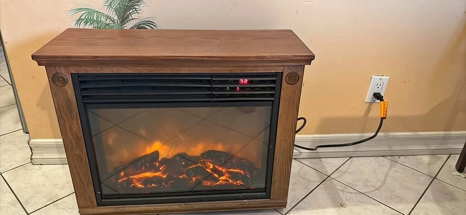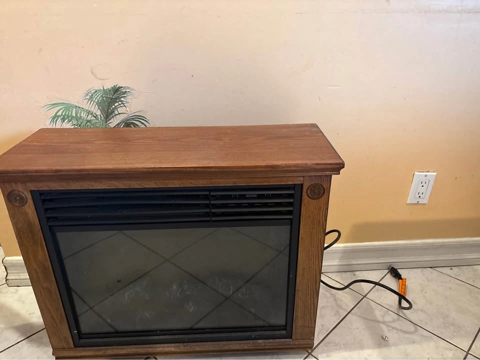Electric fireplace heater in good condition. Heats the room nice and looks good like a TV stand or cabinet. Clean, works great, and easy to plug in and use. Perfect for bedroom, living room, or basement.