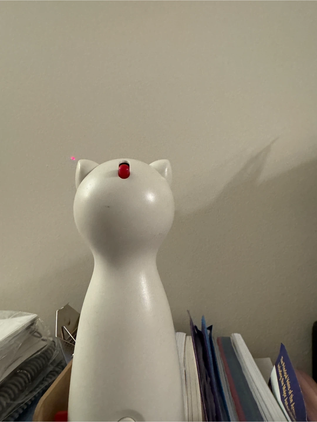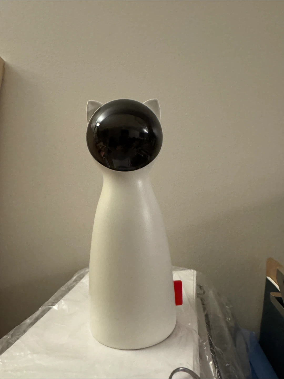 This is a fun interactive cat toy designed to keep your feline friend entertained. It features a sleek white body with cute cat ears and a shiny black face. The toy has a small red switch on the side. It's a great way to provide mental stimulation for your cat!