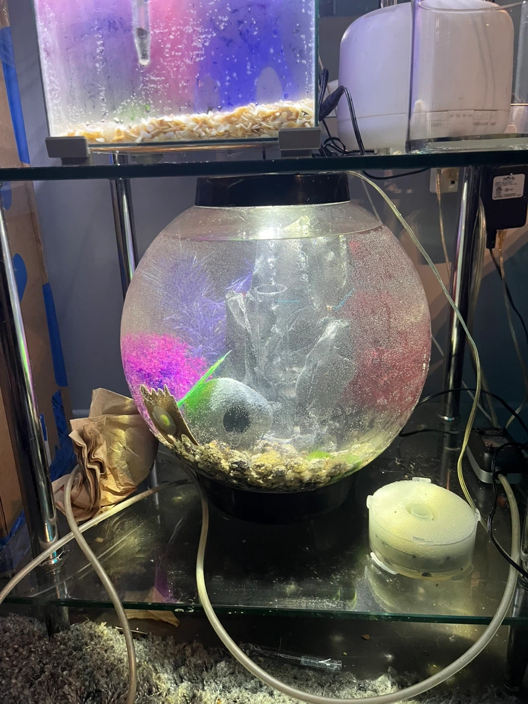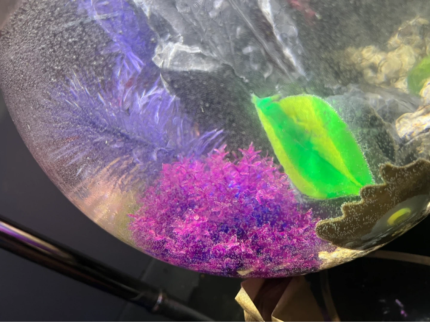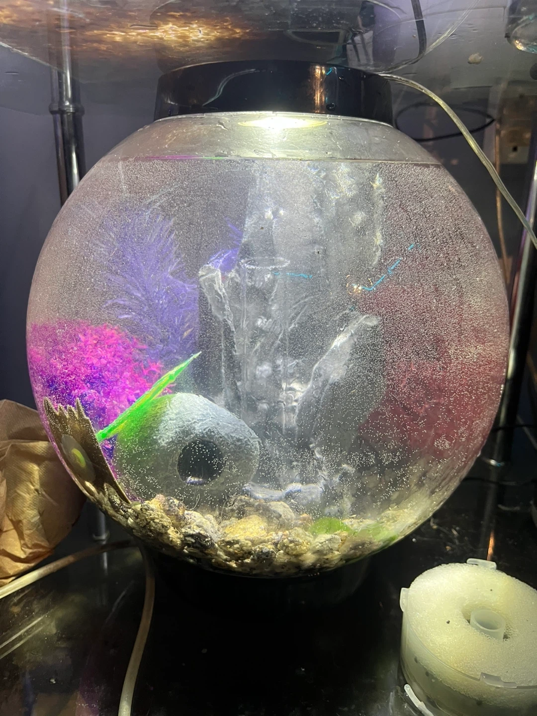 A clear fish tank bowl with colourful artificial plants and gravel. It's a great size for a betta or a few small fish. This tank is ready for a new home! As is