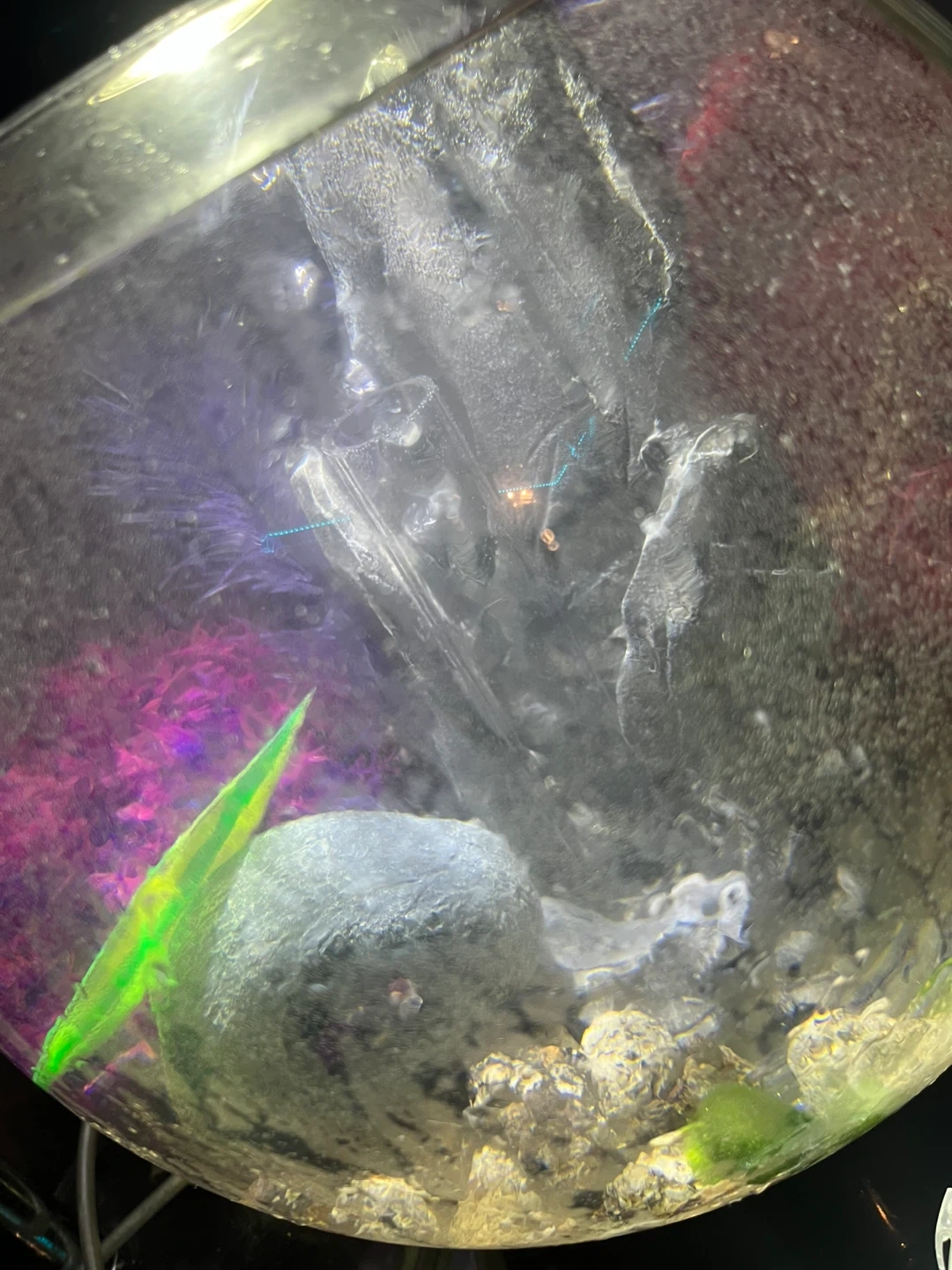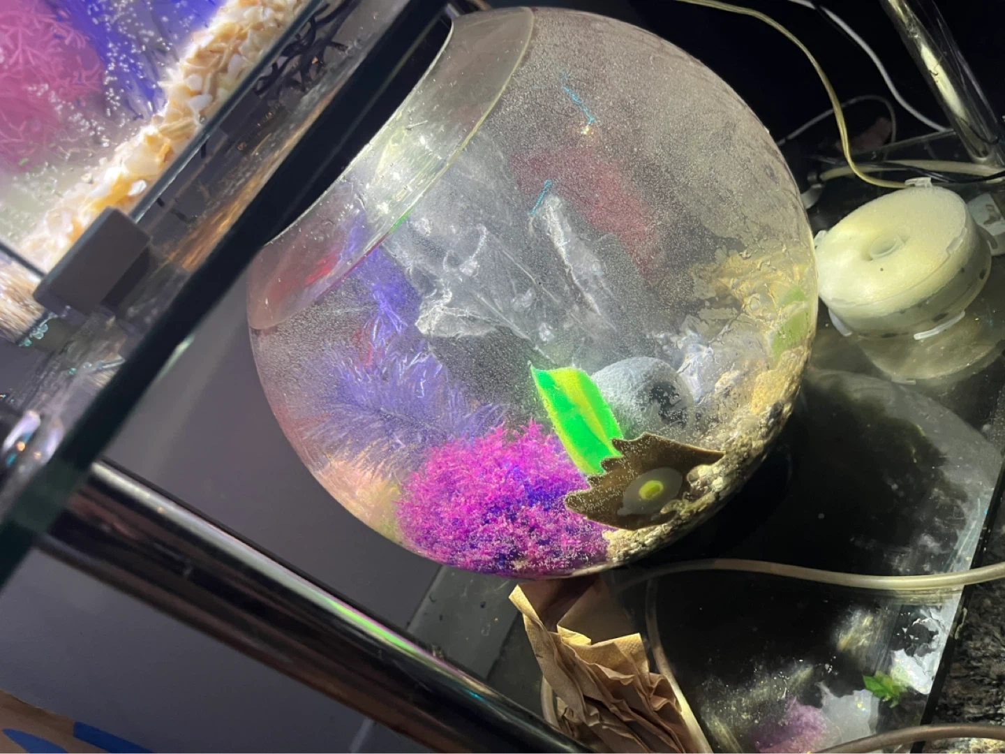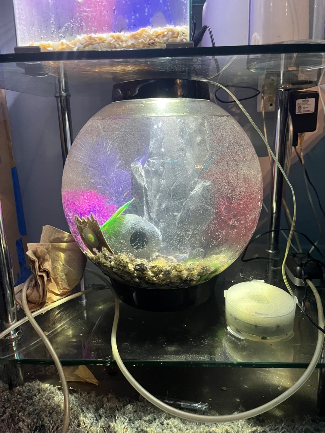 A clear fish tank bowl with colourful artificial plants and gravel. It's a great size for a betta or a few small fish. This tank is ready for a new home! As is