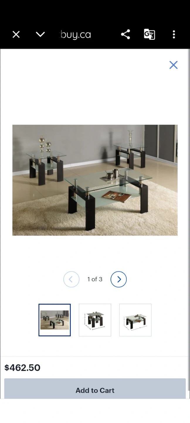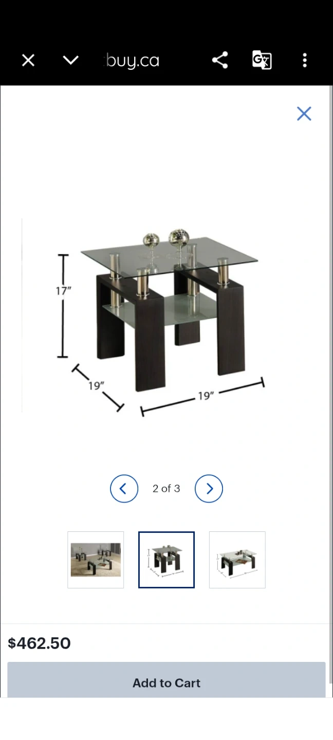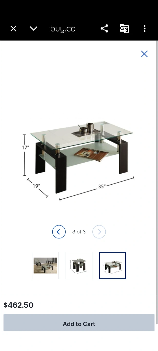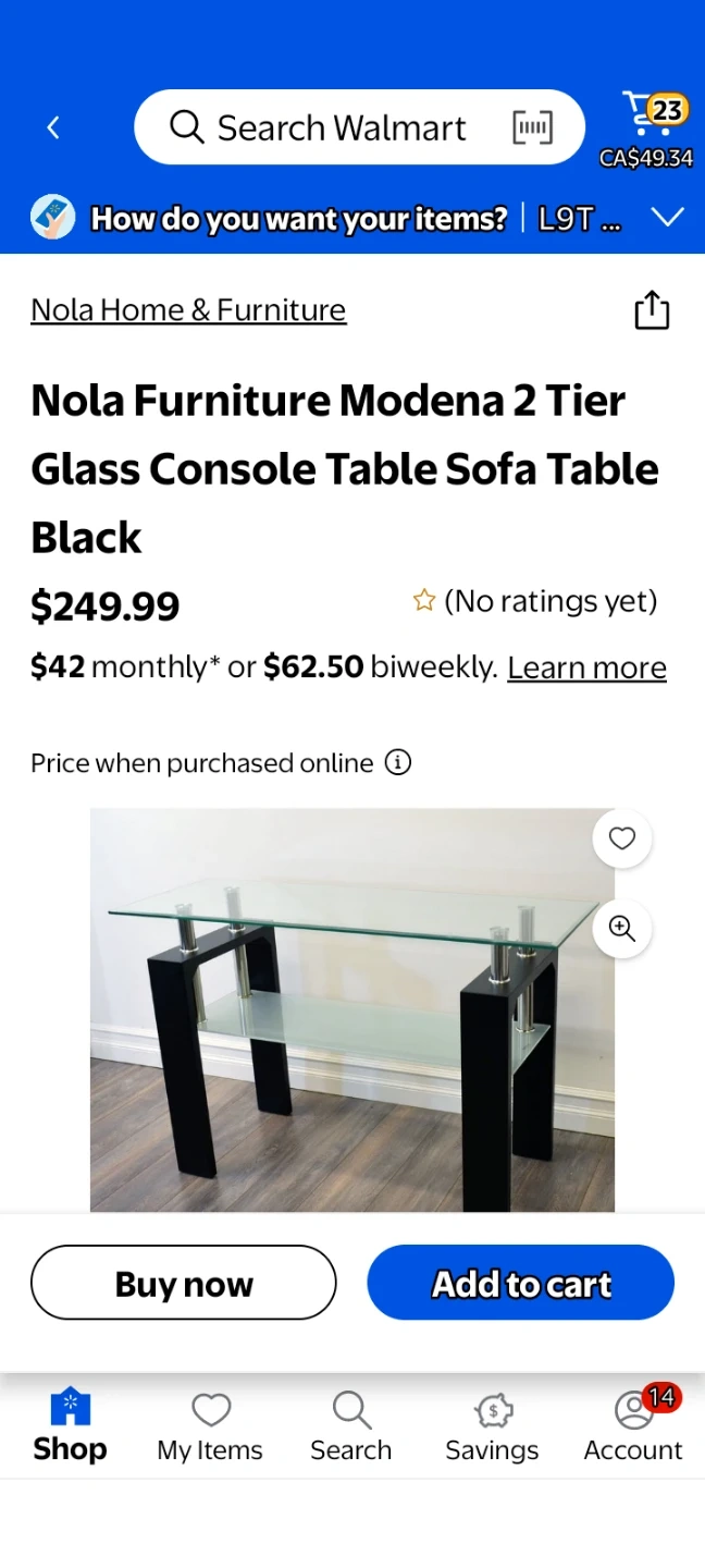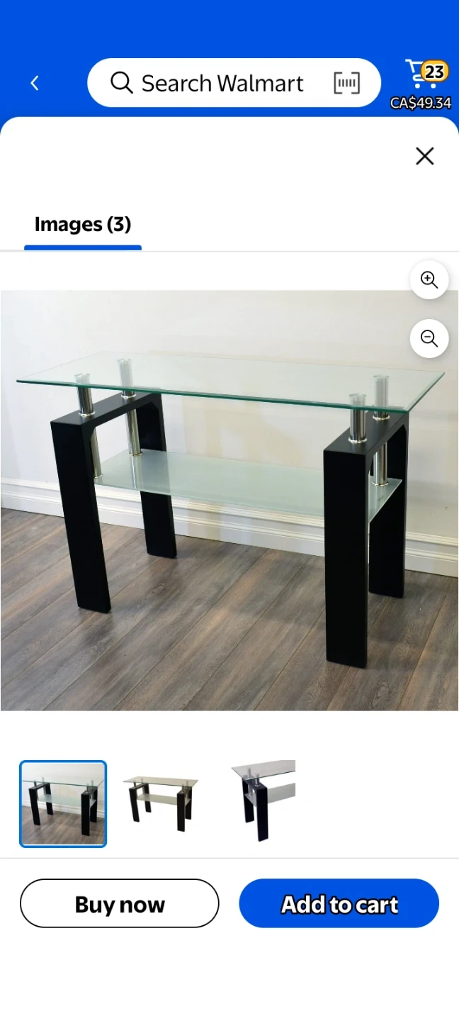 Nola Furniture Modena console table with a 2-tier glass design. Features black wood-look supports and a clear glass top and shelf. Dimensions are 35" long, 17" high, and 19" deep. Set includes coffee table 2 end tables and 1 console table This table would be useful in a living room or den. All 4 pieces available . Price negotiable