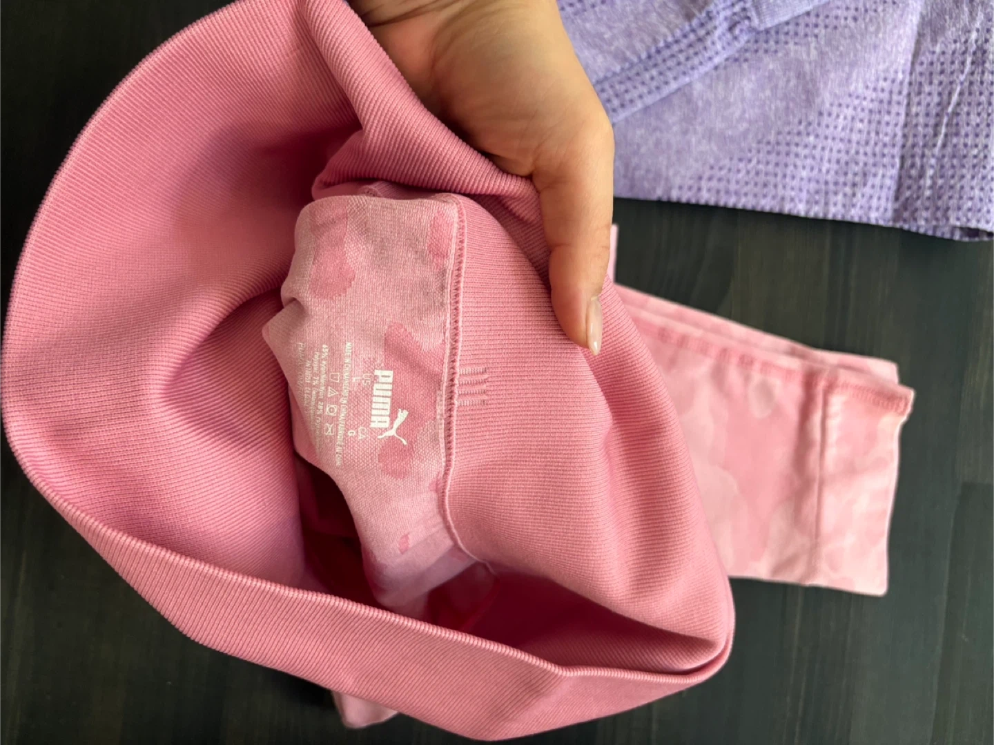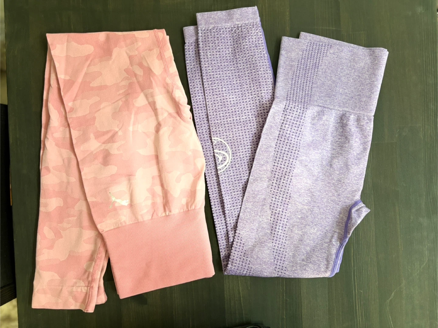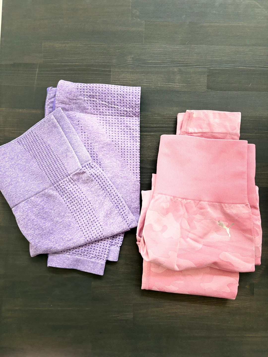 Two pairs of seamless leggings. One in pink camouflage print and the other in solid purple. Pink is Puma and size large and purple one is size medium with both being a high-waisted fit. They're made from a stretchy, breathable fabric perfect for workouts.