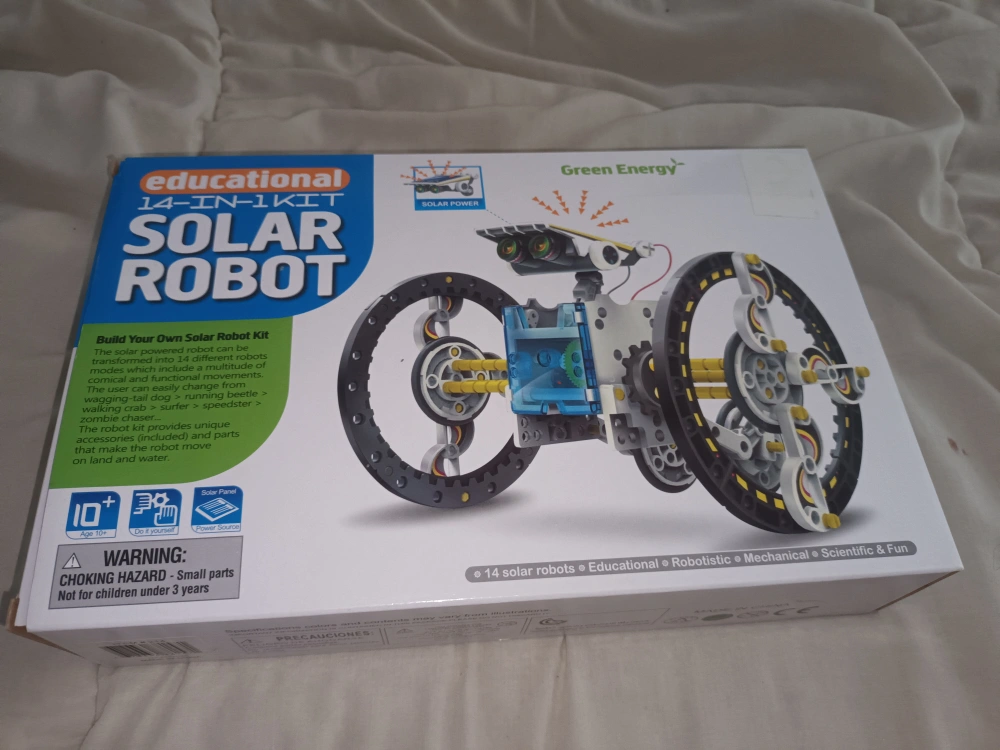 I'm selling a brand new Educational 14-in-1 Solar Robot kit! This kit allows you to build 14 different robot modes, all powered by solar energy. It's a fun and educational toy for kids aged 10 and up. The kit includes all the necessary accessories and parts to make the robot move on both land and water.