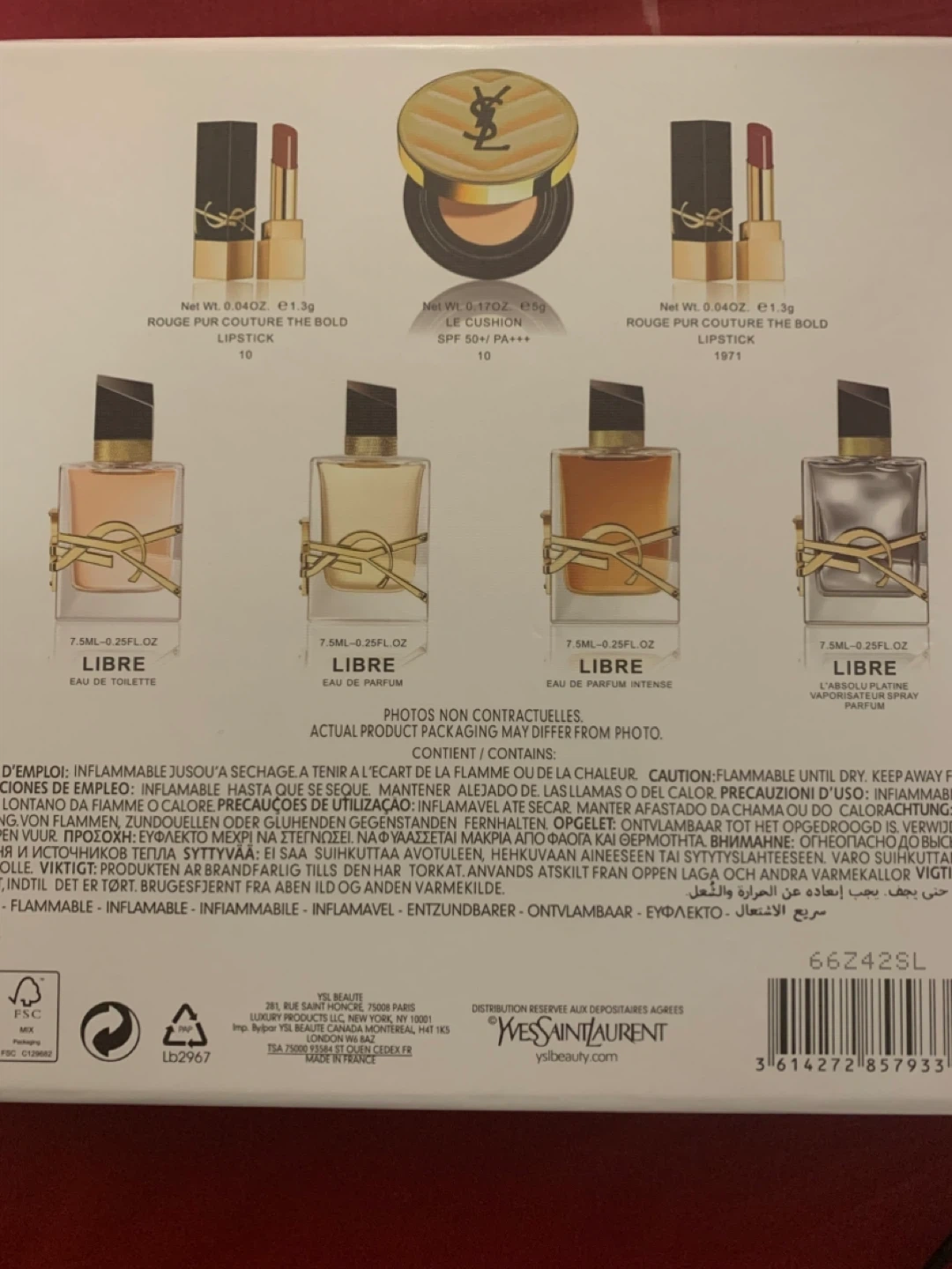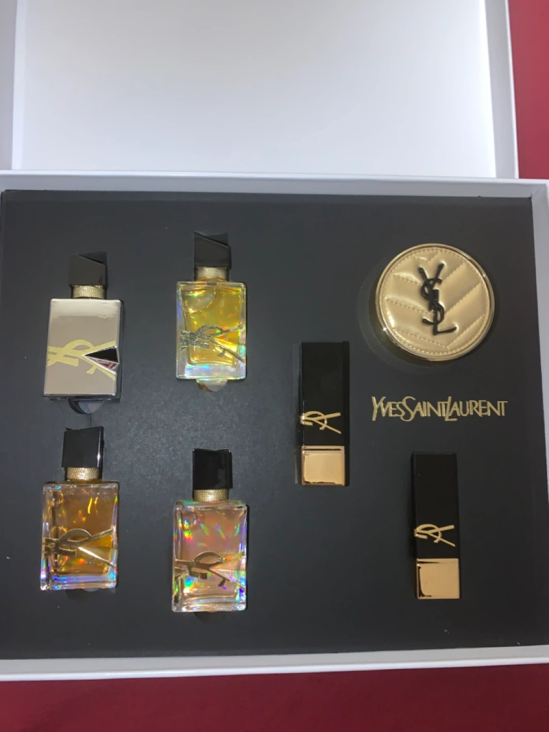 This Yves Saint Laurent gift set includes four miniature "Libre" fragrances in Eau de Toilette, Eau de Parfum, Eau de Parfum Intense, and Vaporisateur Spray versions. It also contains two "Rouge Pur Couture The Bold" lipsticks and an SPF cushion compact. A fantastic collection of YSL beauty essentials!