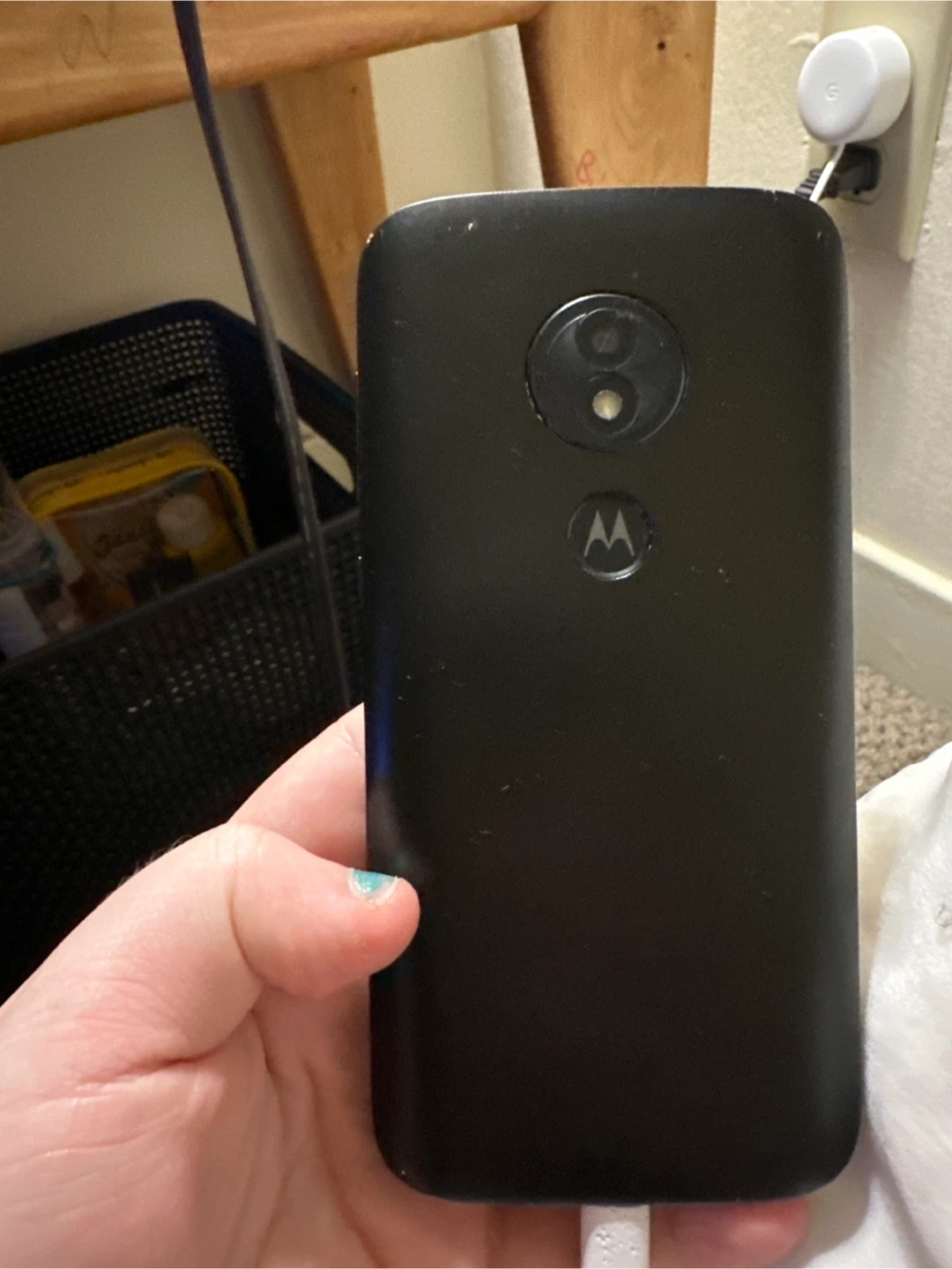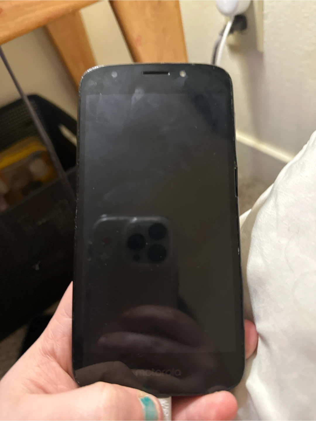 A black Motorola cell phone. It's a smartphone. It’s perfect as a first phone for your kid, easy for work, and using as a backup phone! It’s reset already, and good to go!