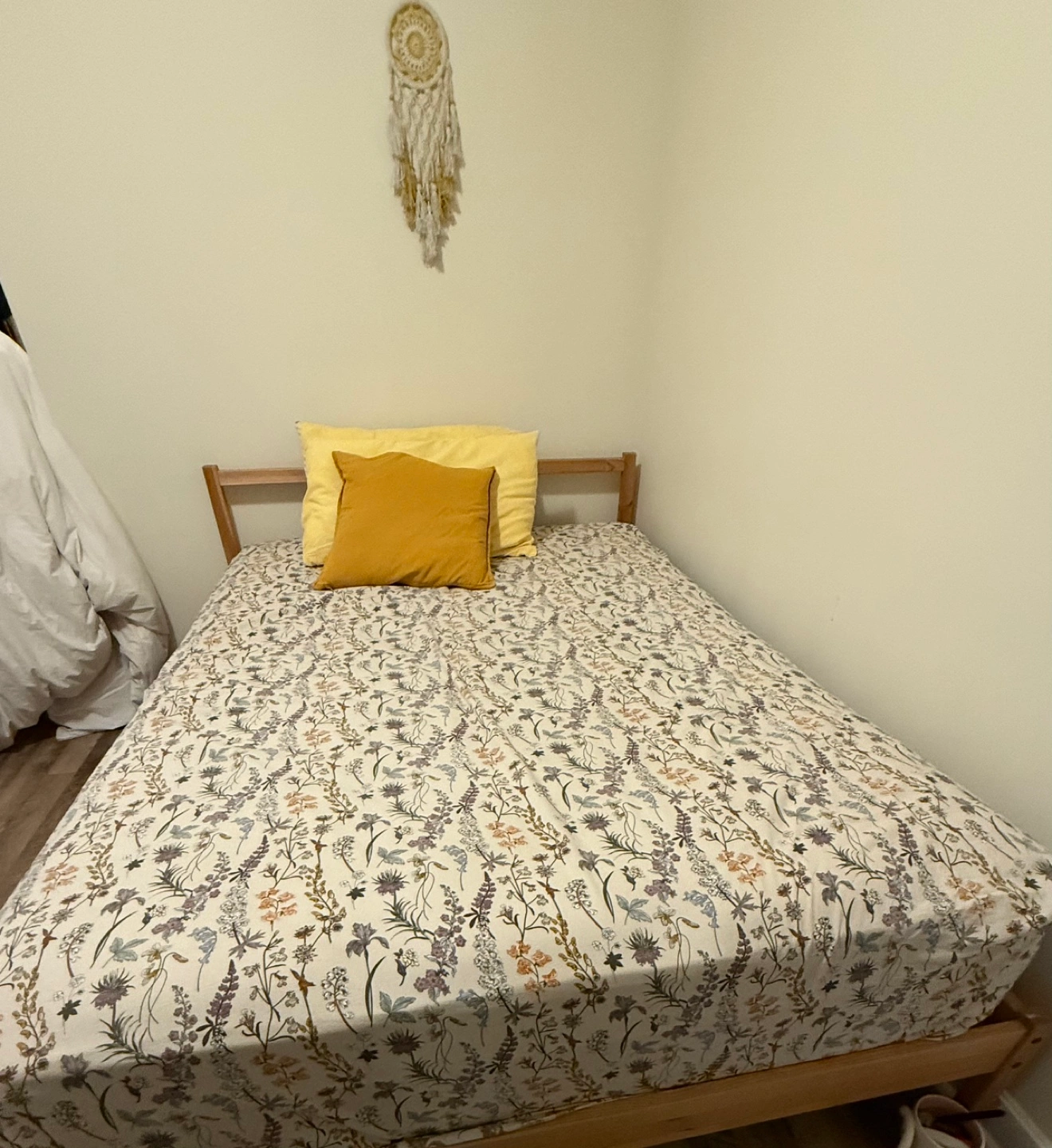 Wooden queen bed frame. Simple design, light wood colour. Minimalist style. Includes frame comes with Matters, Duvet and Two pillows