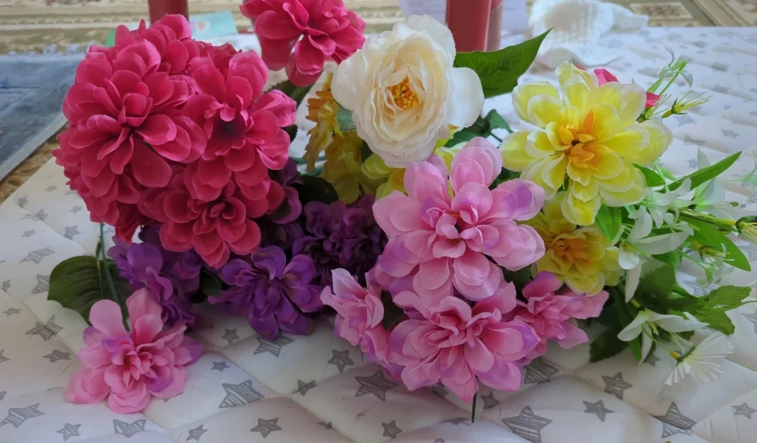 A lovely arrangement of artificial flowers in vibrant colours. Includes pink, purple, yellow, and white blooms. These flowers are great for adding a pop of colour to any room!