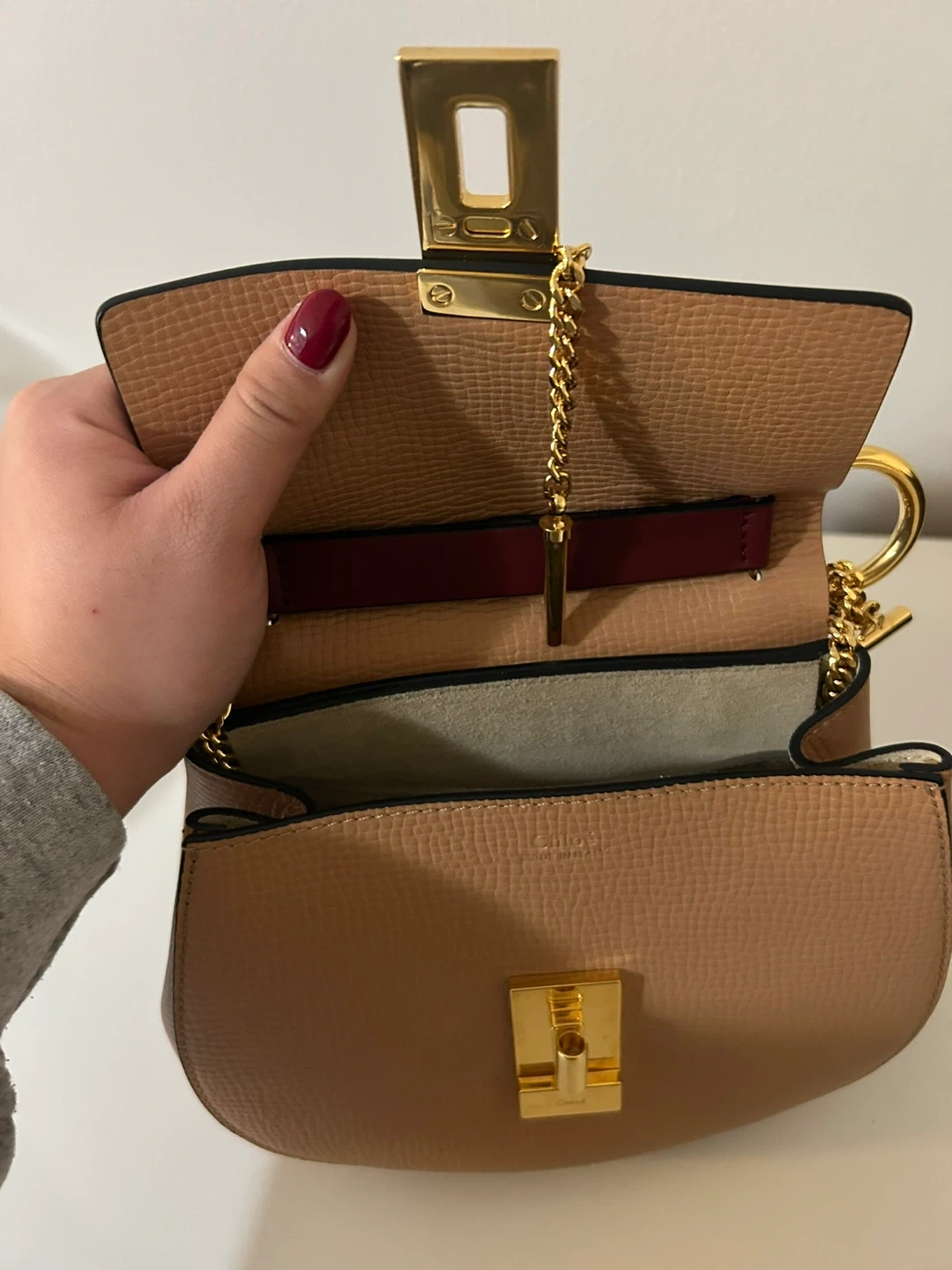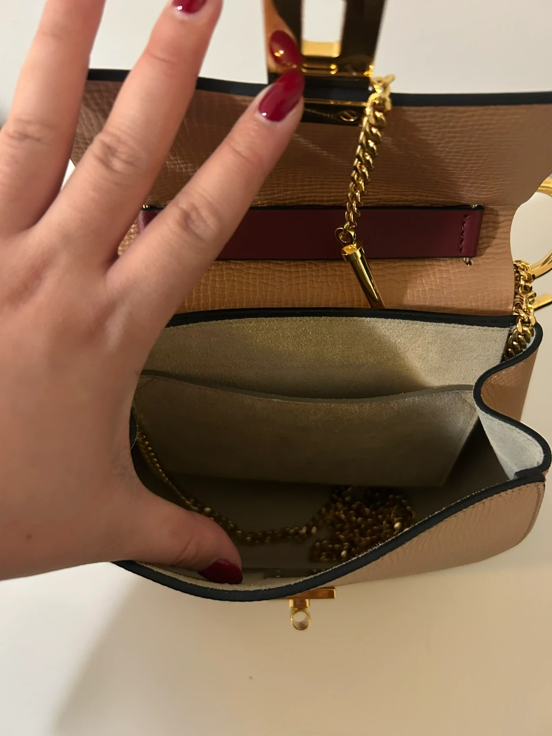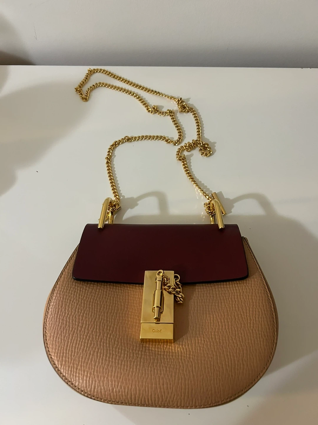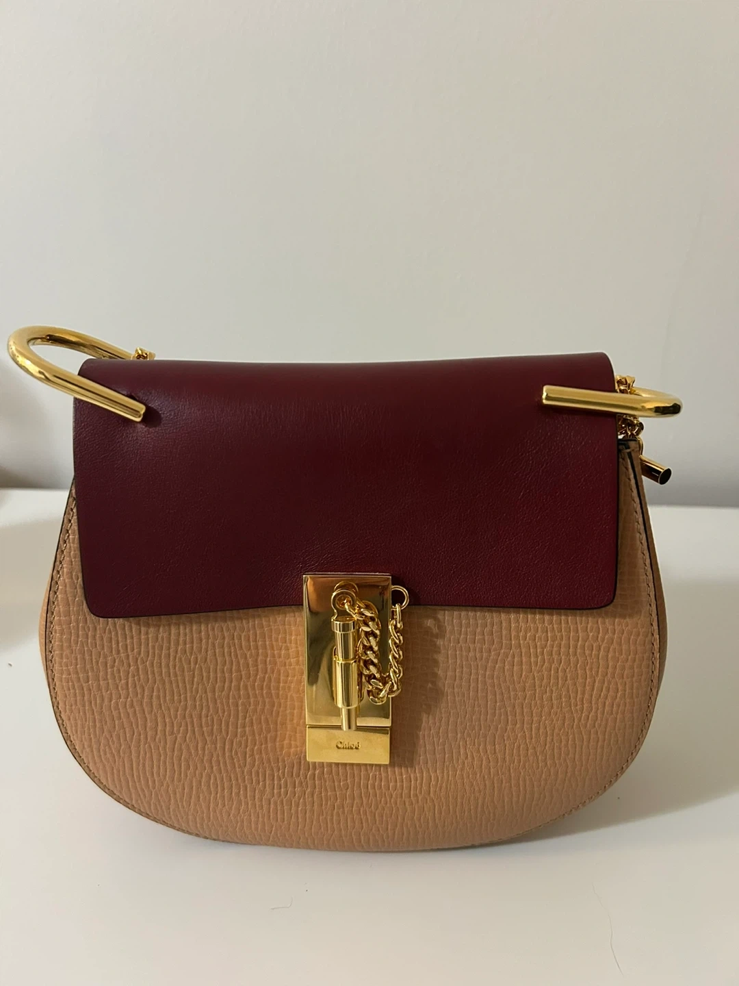 Chloé small Drew shoulder bag in burgundy and tan textured leather. It has a gold-tone chain strap and a signature clasp closure. Inside, it's lined with suede and features an open pocket. Never used