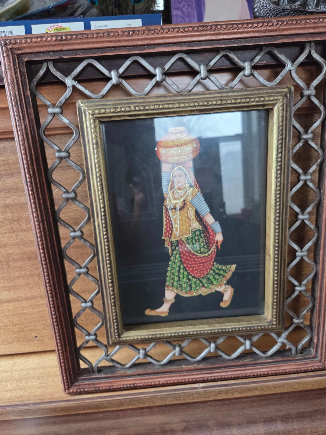 This framed artwork depicts an Indian woman carrying a pot on her head. The detailed painting is set within an ornate wooden and metal frame. It's a lovely piece for home decor.