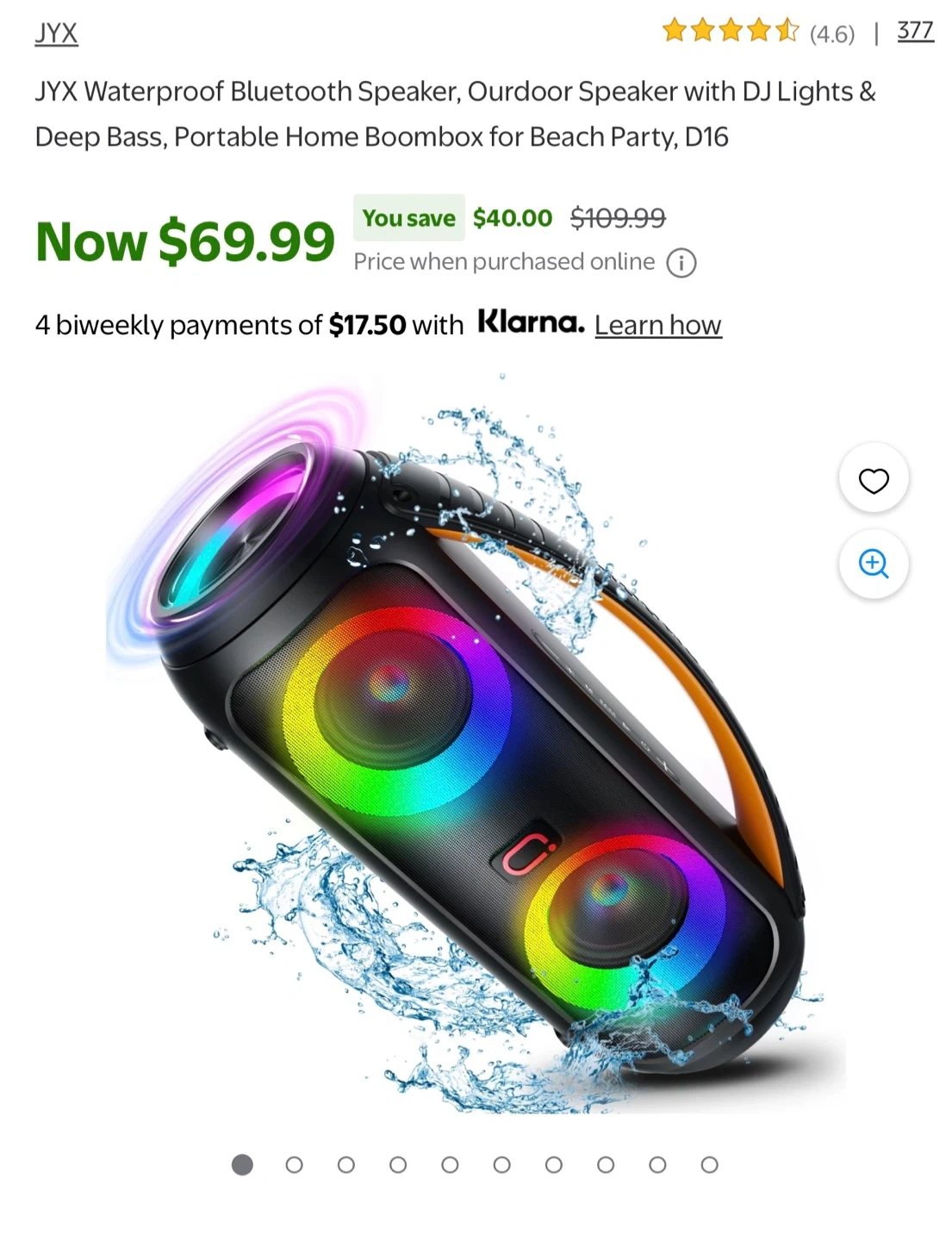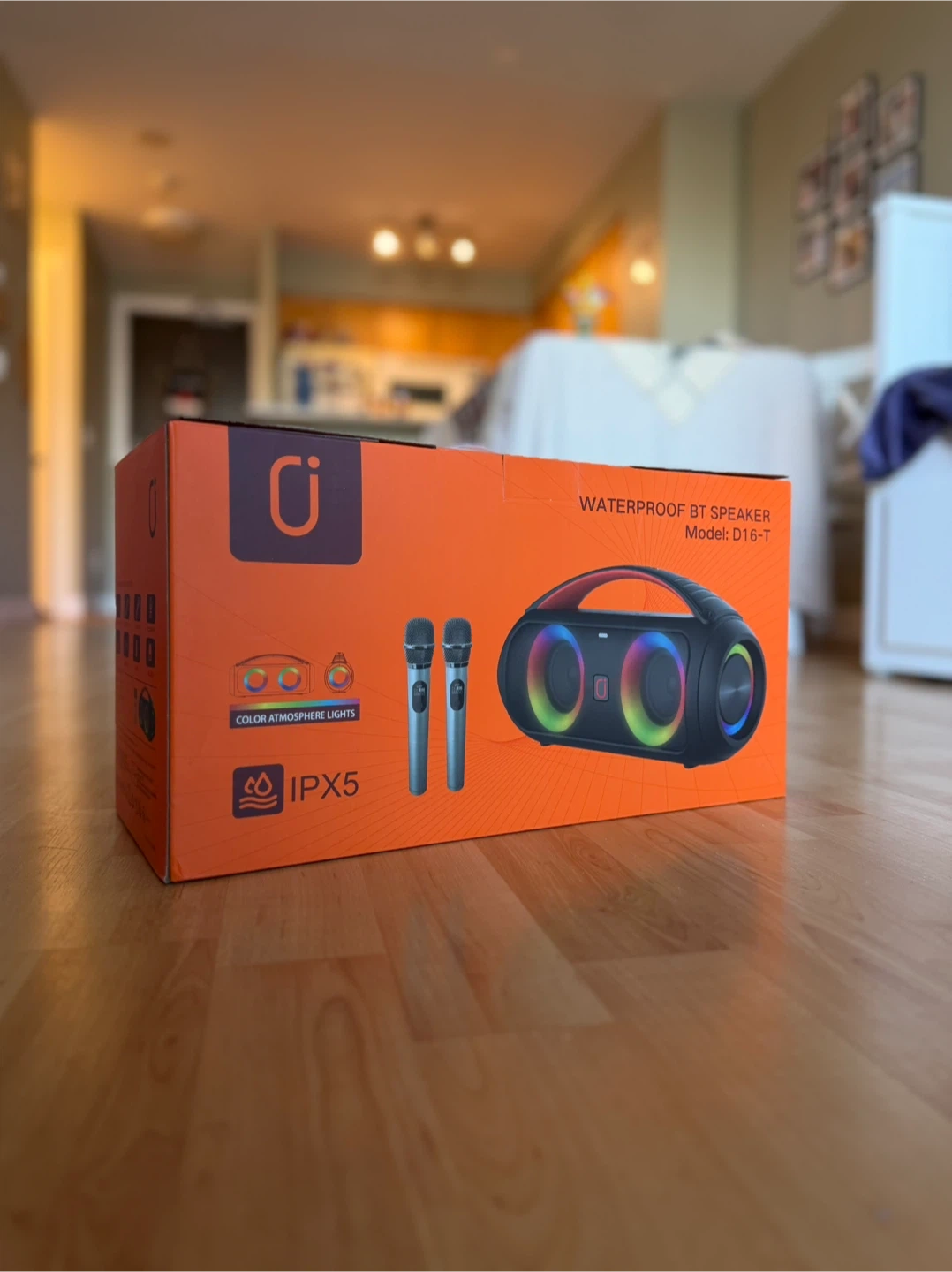 This waterproof BT speaker features color atmosphere lights and comes with two microphones. It has an IPX5 rating for water resistance. It's great for outdoor gatherings or parties! Retails for $70 + taxes in Walmart