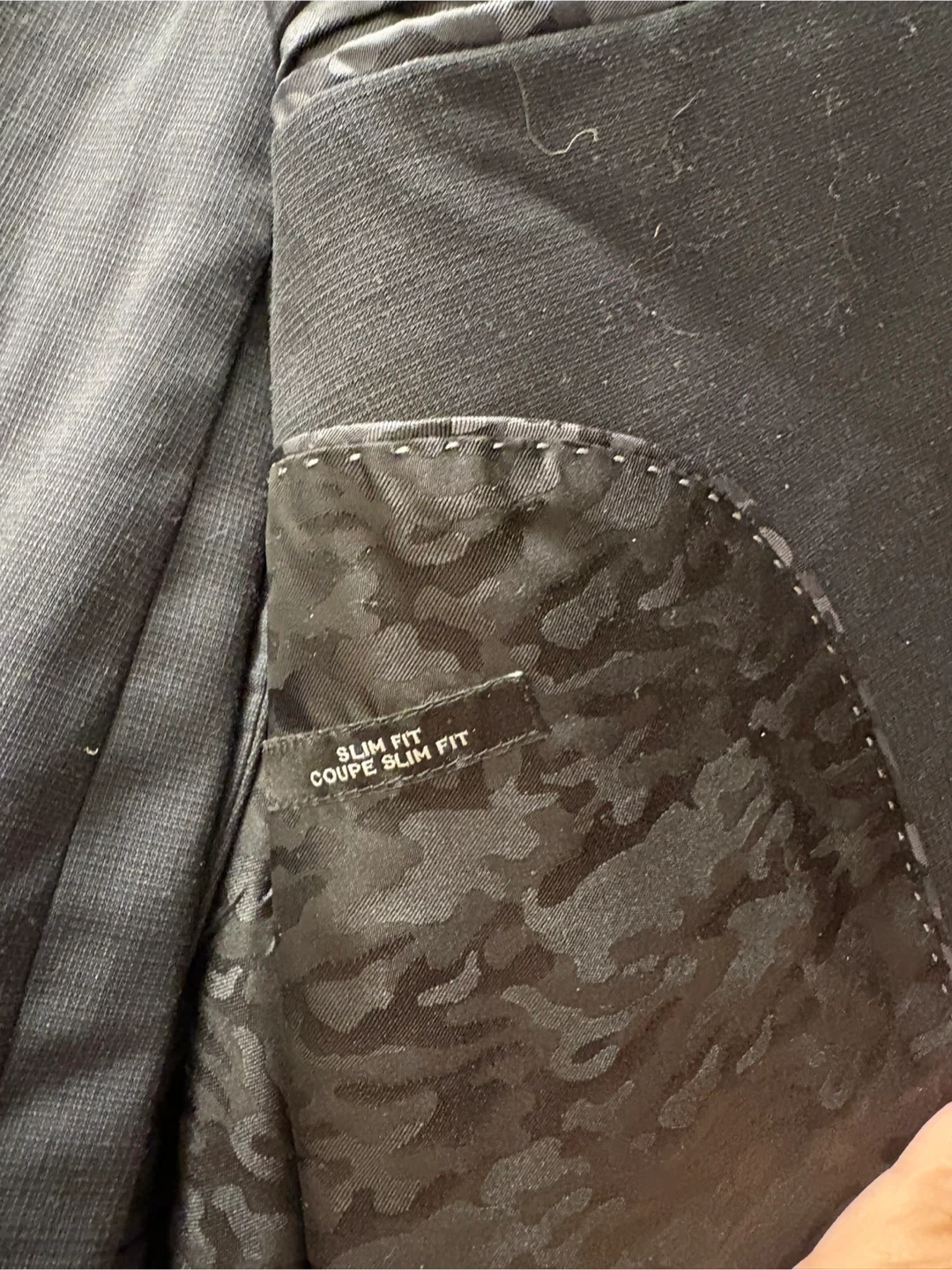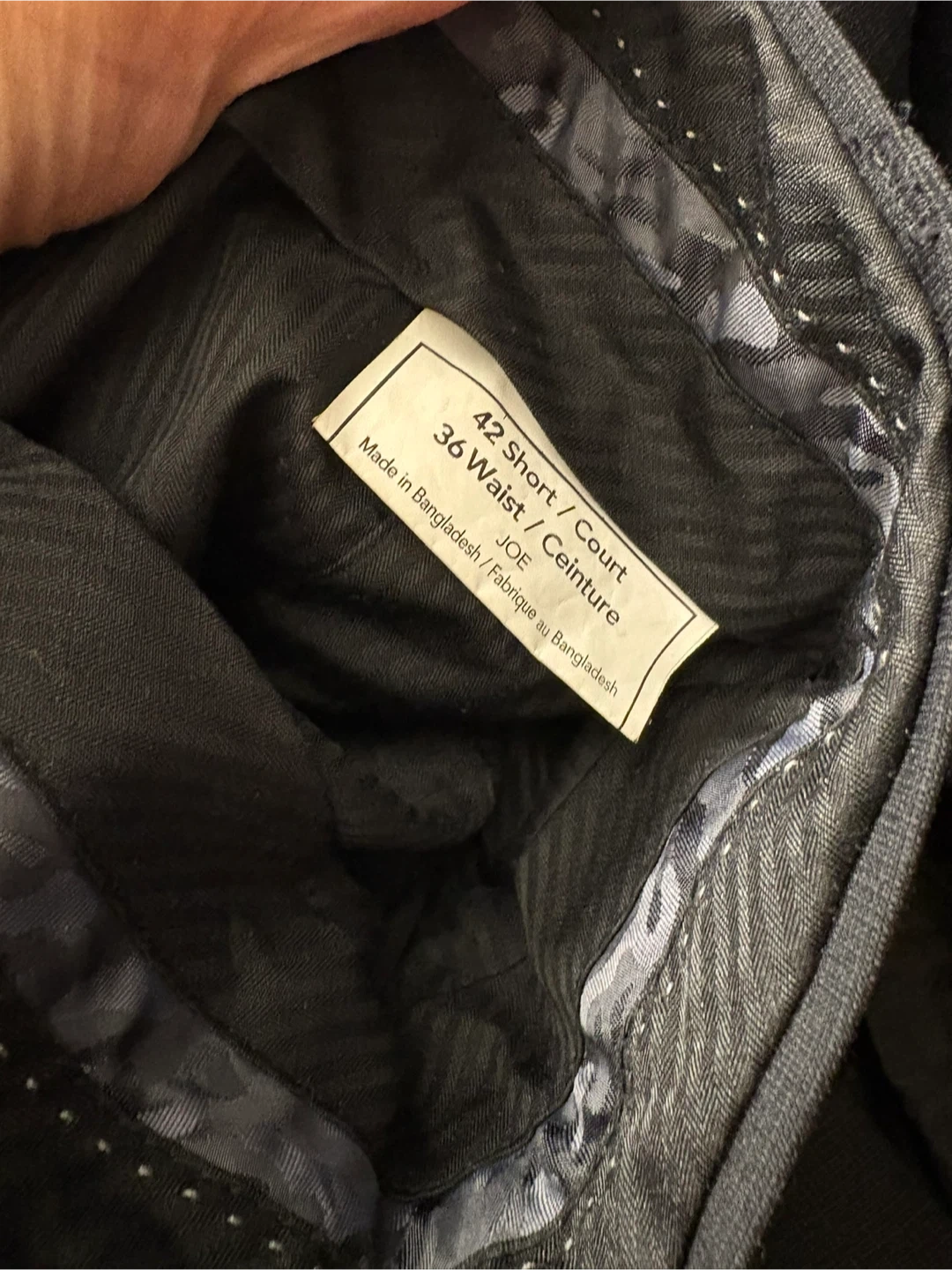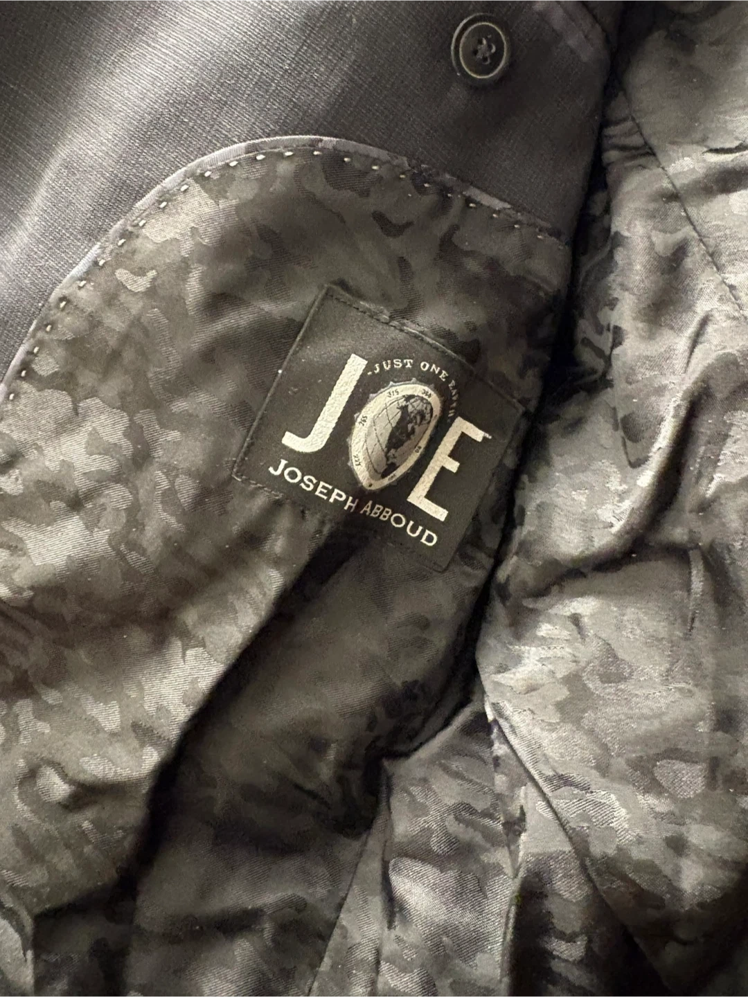 Details:• Brand: Joseph Abboud – JOE line• Suit includes blazer + matching pants• Jacket size: 42 Short• Pants size: 36 waist• Fit: Slim Fit / modern tailored cut• Colour: Classic black• Stylish patterned interior lining