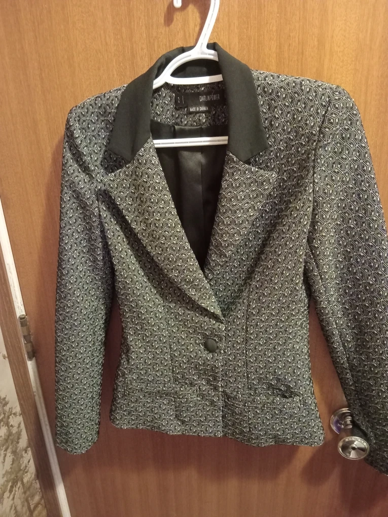 I'm selling a Caitlin Power blazer, made in Canada! It's a size 2 and features a unique geometric pattern. Perfect for adding a touch of Canadian style to your wardrobe