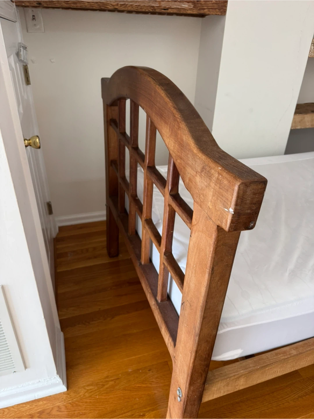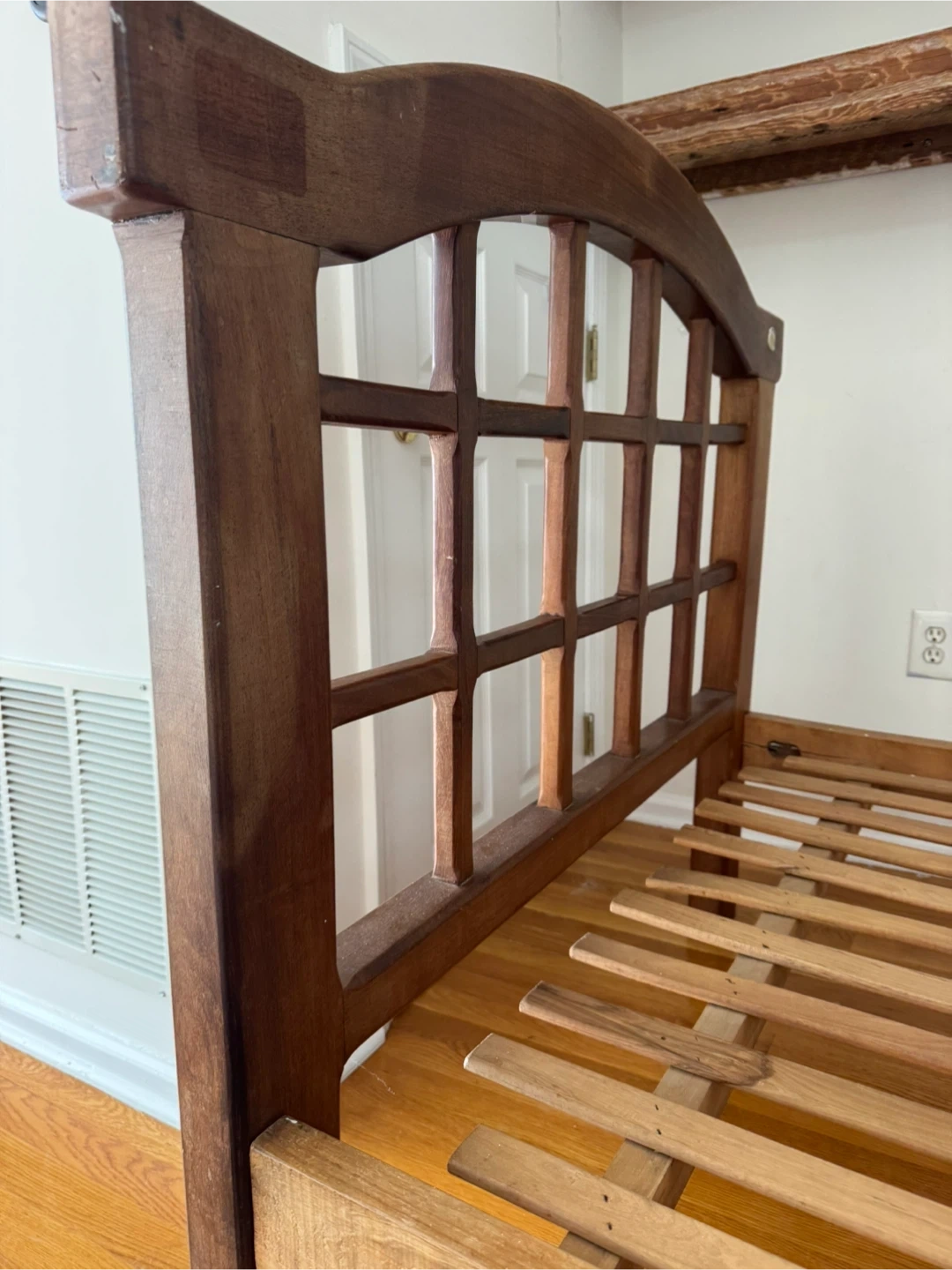 A solid wooden bed frame with a dark wood finish. It features a distinctive arched headboard with a grid pattern. Includes wooden slats for mattress support. Bed frame is made of wood.