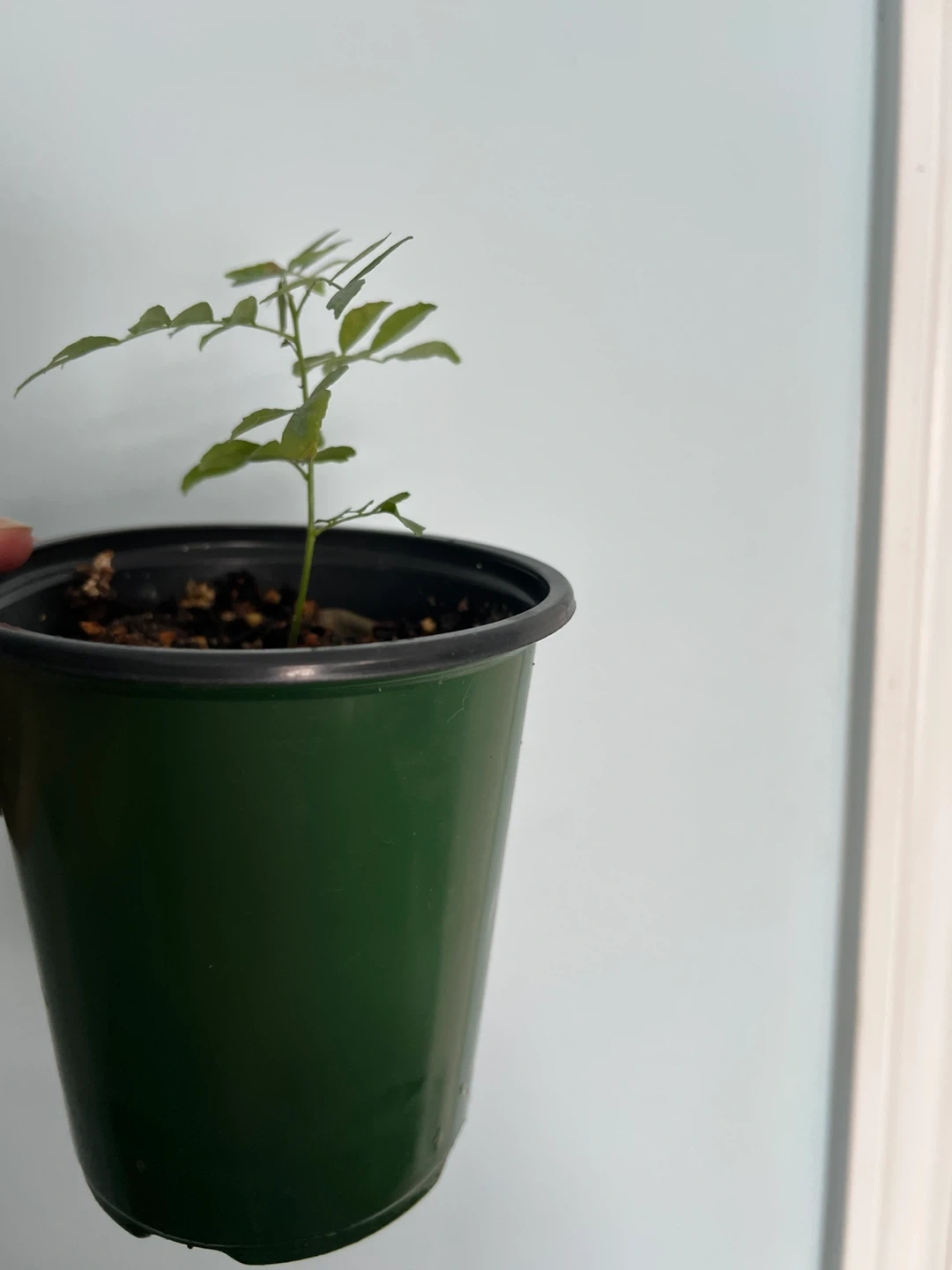 This is a small, healthy green plant in a dark green pot. It's ready to be transplanted or cared for as is. It has delicate leaves and a sturdy stem.