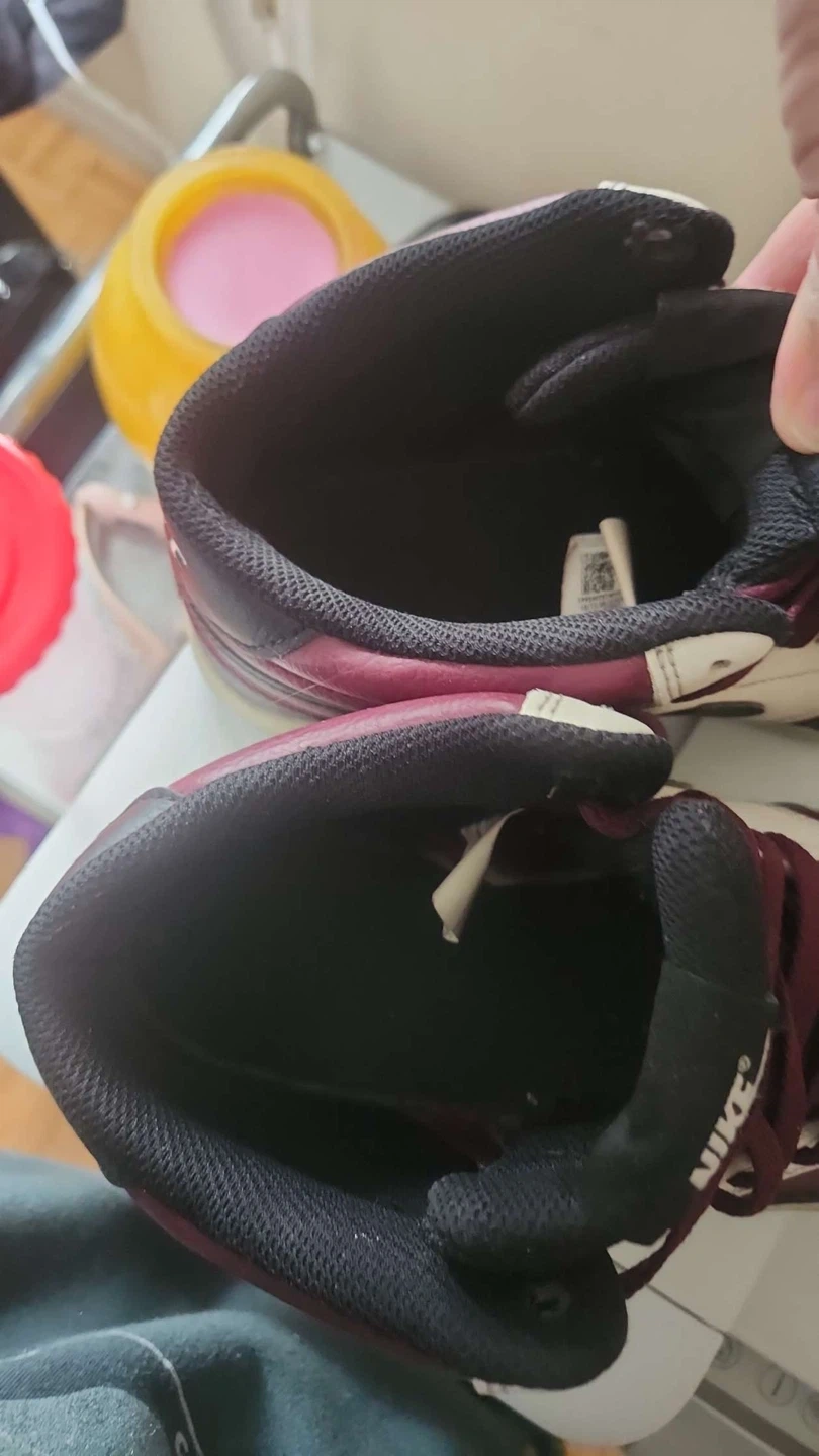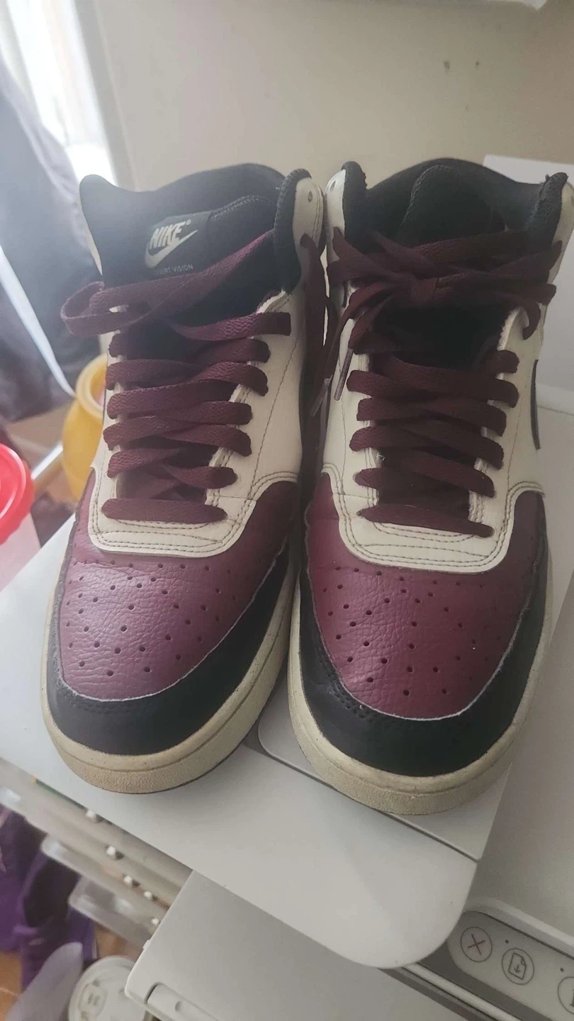 Classic Nike sneakers in a burgundy, white, and black colourway. These high-top shoes are a statement piece for any sneaker collection. They feature a leather and synthetic upper with a rubber sole for durability PRICE IS NEGOTIABLE AVAILABLE FOR HOME PICK UP No box need them gone asap