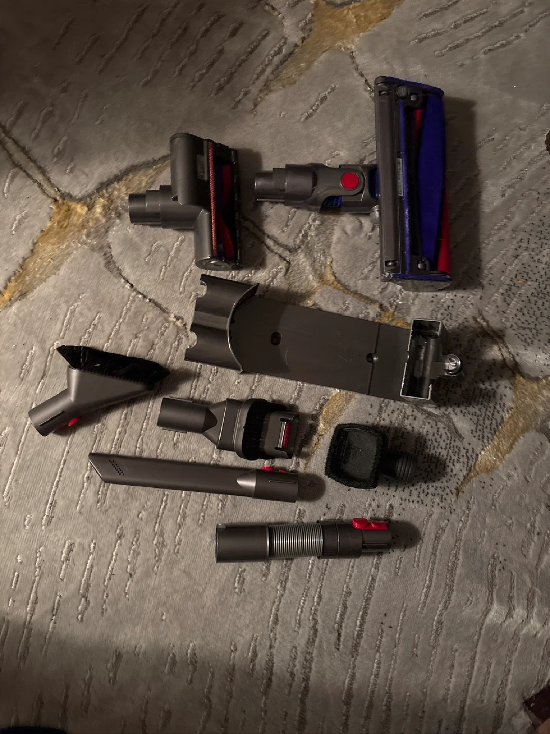 Dyson stick vacuum models V7-V15 compatible stick vacuum attachments (7 pieces including both large and small power brush heads, crevice tool, etc, and docking station). Excellent condition and fully functional.