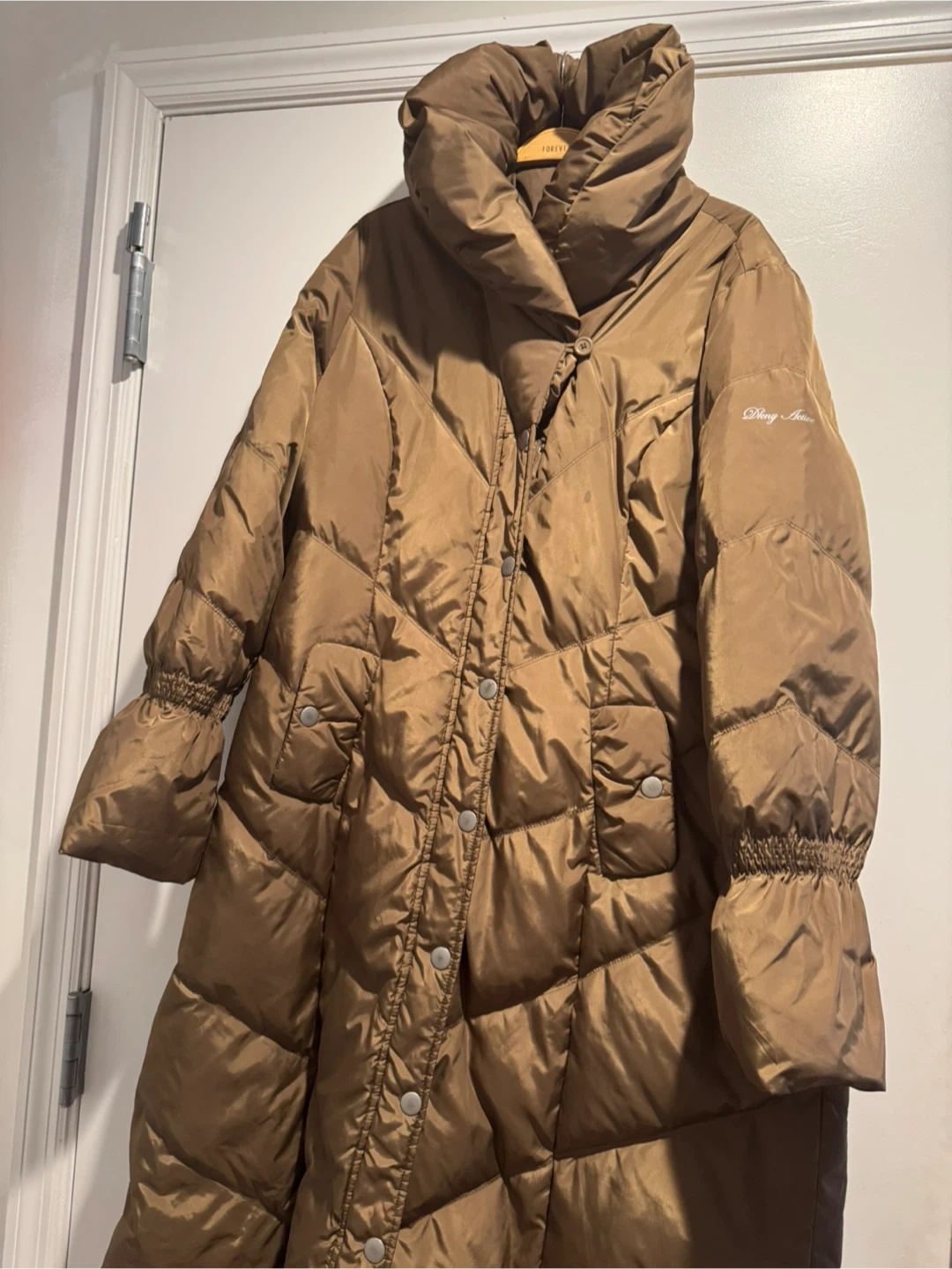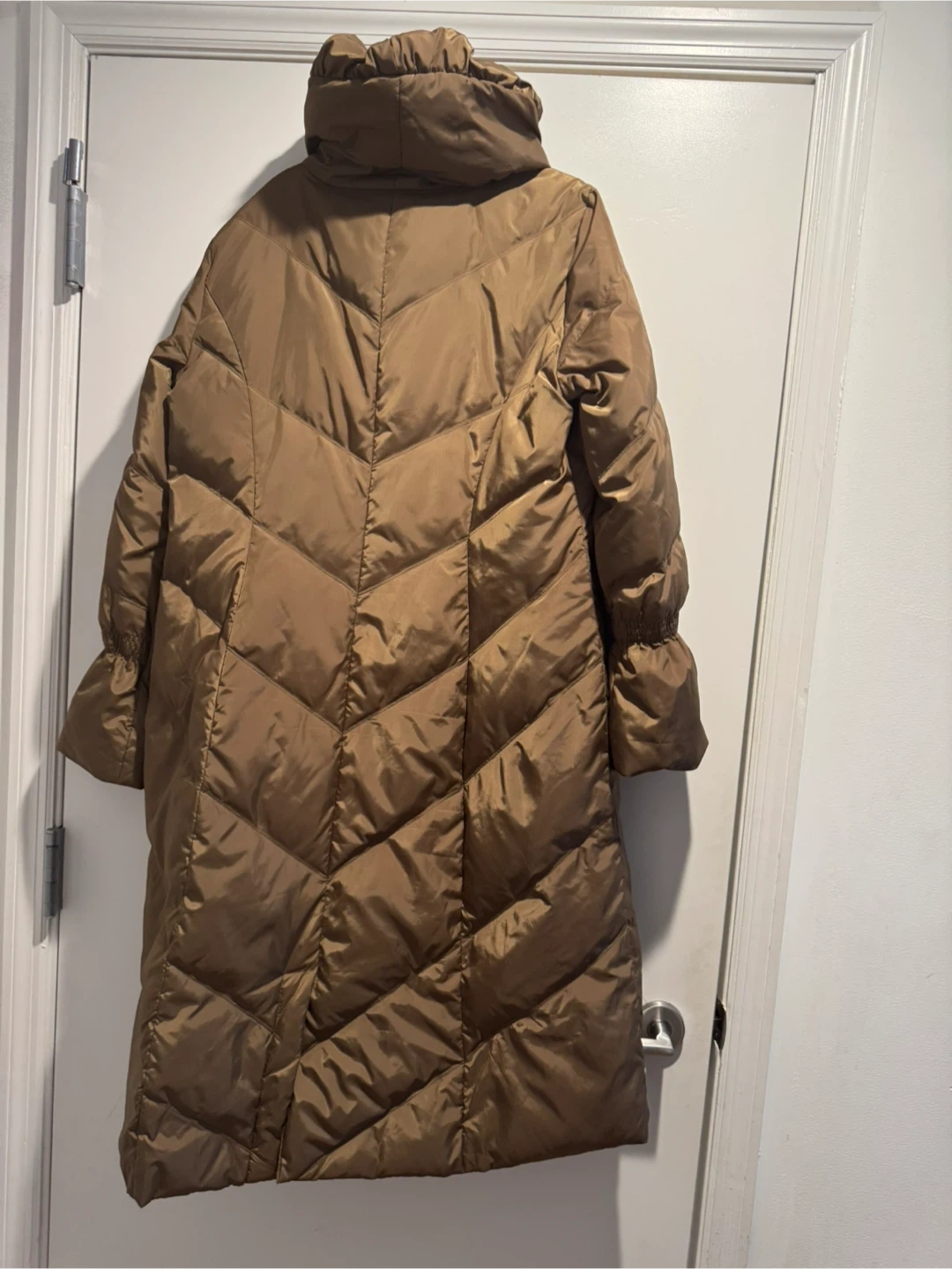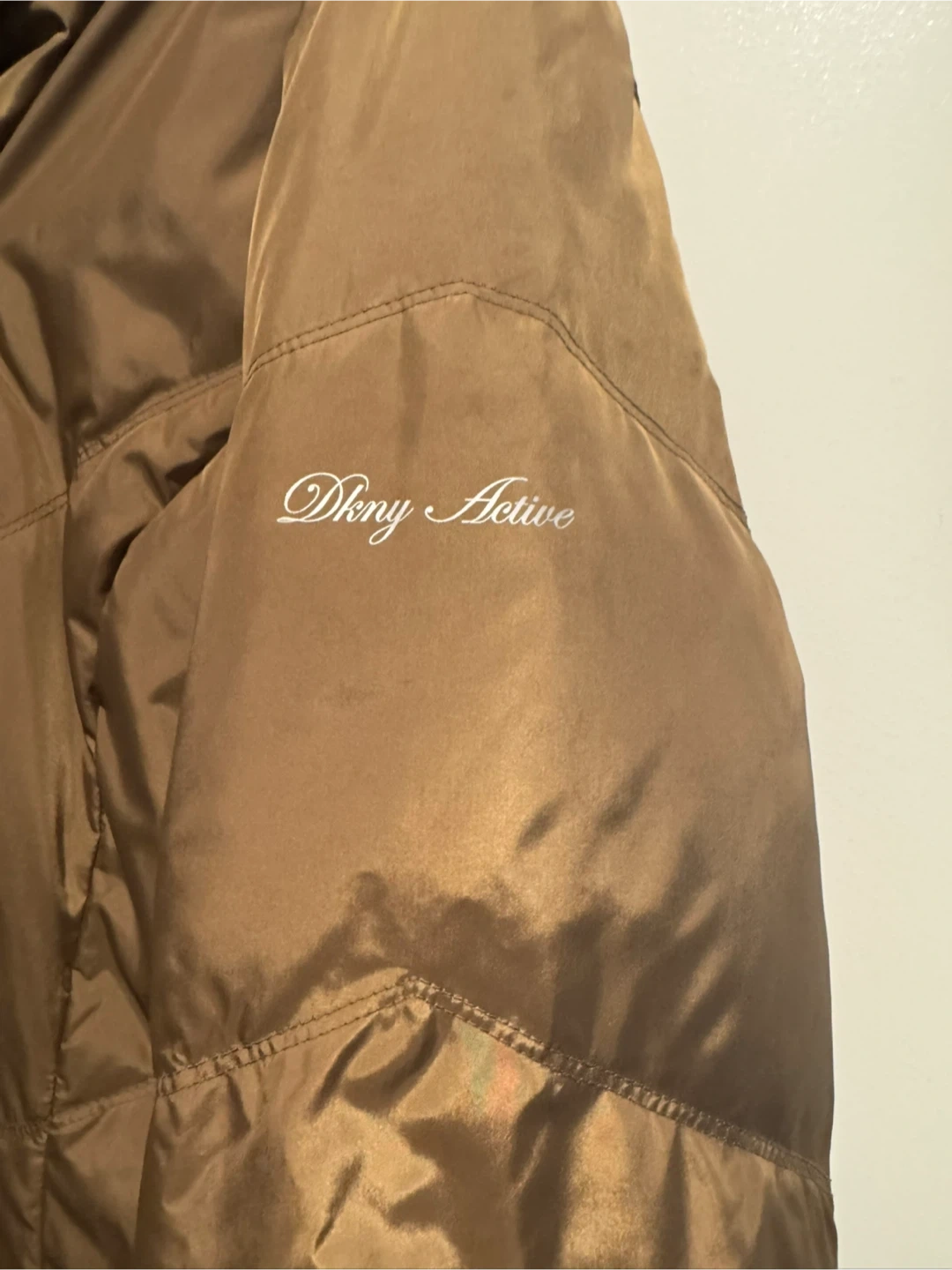 Selling a DKNY Active puffer zipper coat in taupe 2 side pockets ! It's a size XL and has a long 3 snaps in the back at the bottom of coat , warm design perfect for colder weather with the cow neck collar!