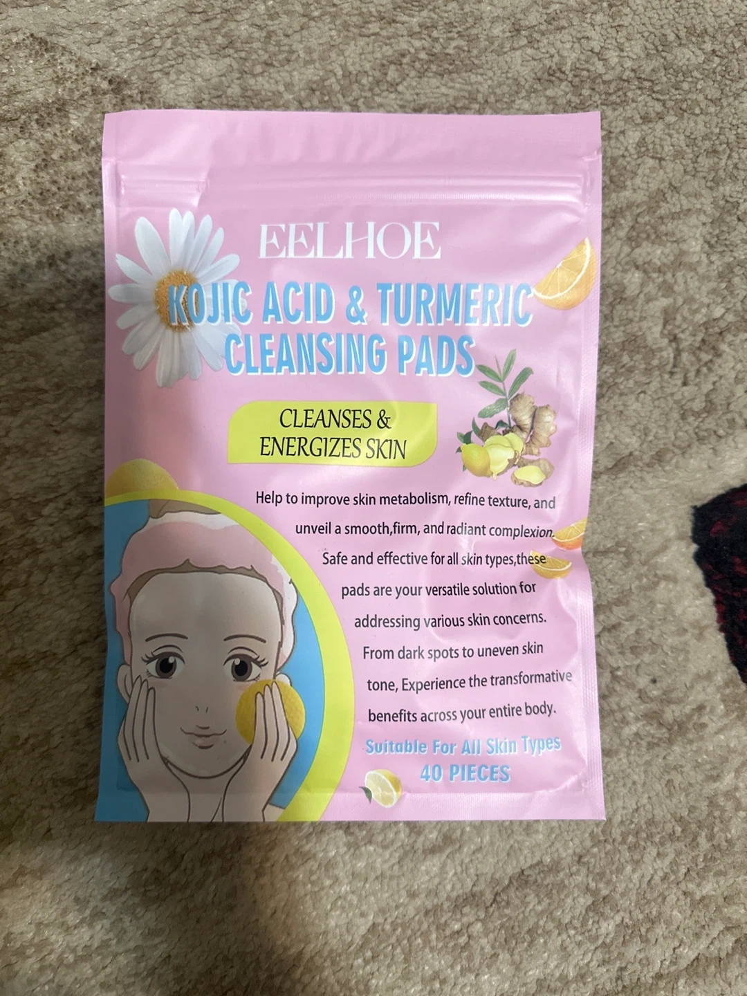 I'm selling EELHOE Kojic Acid & Turmeric Cleansing Pads. These pads cleanse and energize your skin, helping to improve skin metabolism, refine texture, and unveil a smooth, firm, and radiant complexion. They're safe and effective for all skin types, and are a versatile solution for addressing various skin concerns, from dark spots to uneven skin tone. There are 40 pieces in the package