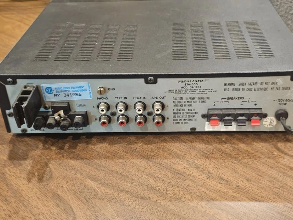 Realistic STA-300 stereo receiver with built-in AM/FM tuner. Includes phono input for turntables, plus CD/AUX and tape inputs. Simple and reliable setup for vintage audio systems. All controls working, display lights up. Good condition.