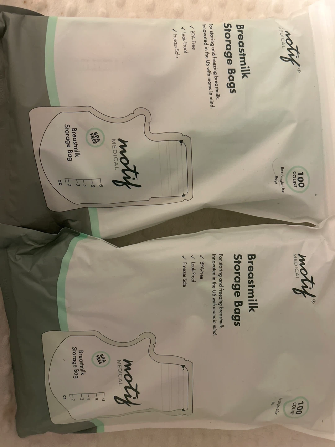 These are Motif Medical breastmilk storage bags for storing and freezing breastmilk. They're BPA-free, leak-proof, and freezer safe. Each box contains 100 bags.