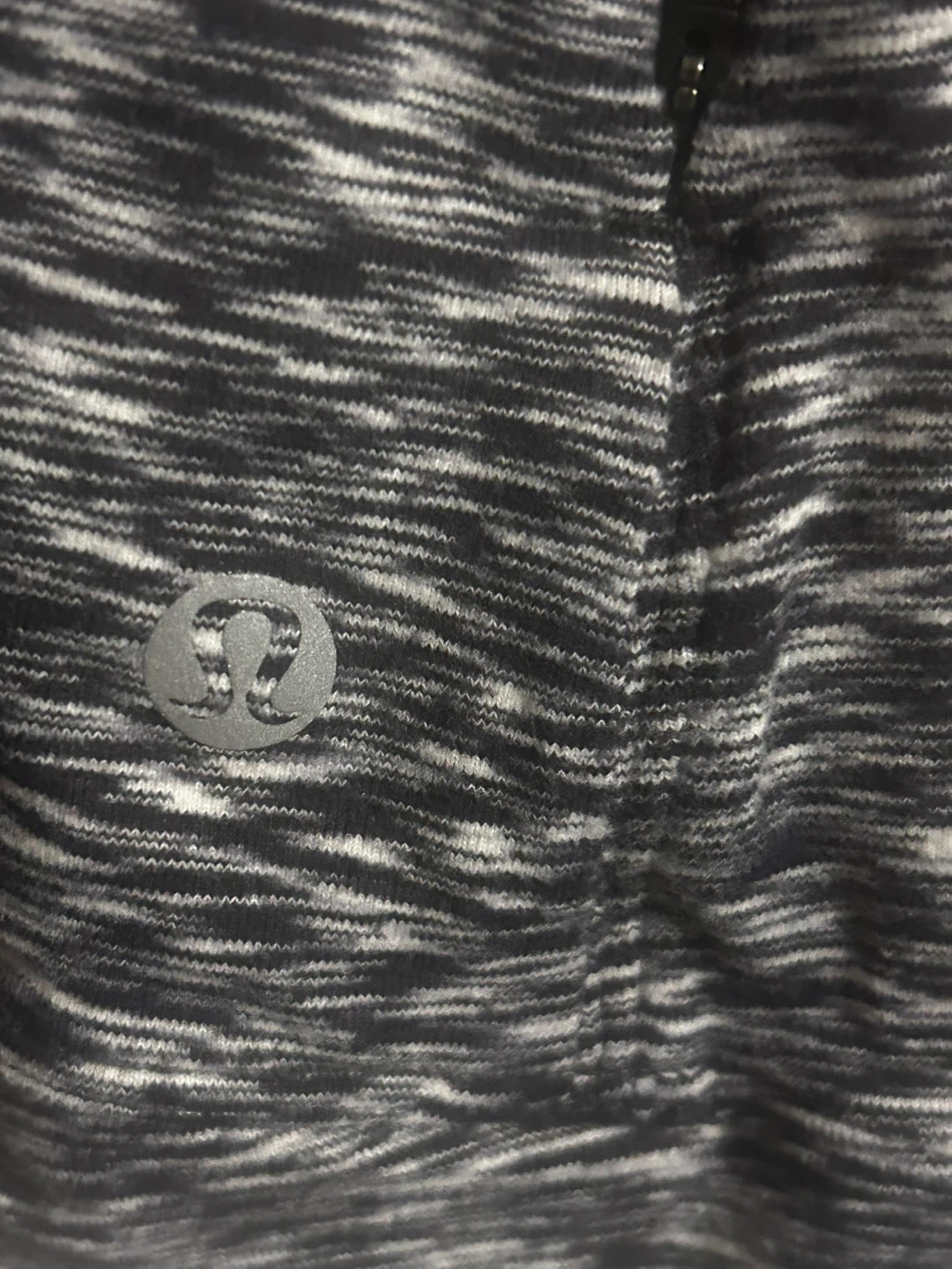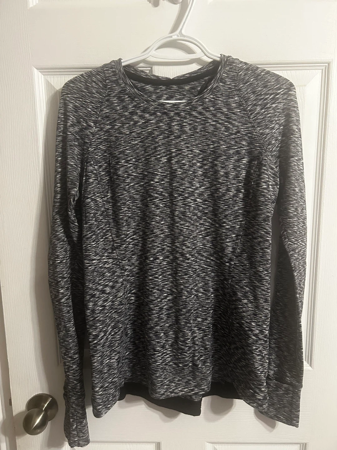 This is a Lululemon Runderful Long Sleeve shirt in a size 10. It's a black and white space dye pattern. Material is breathable and lightweight, perfect for running or workouts. Thumbholes at the cuffs for extra coverage.