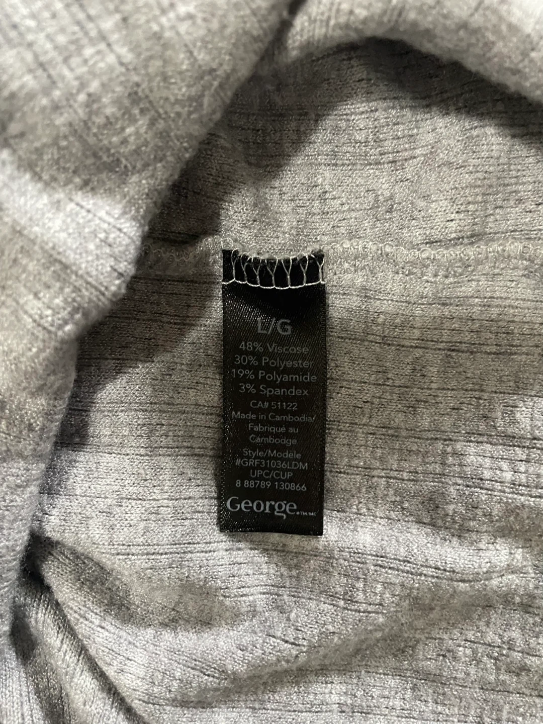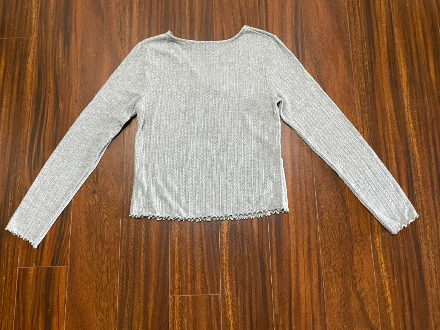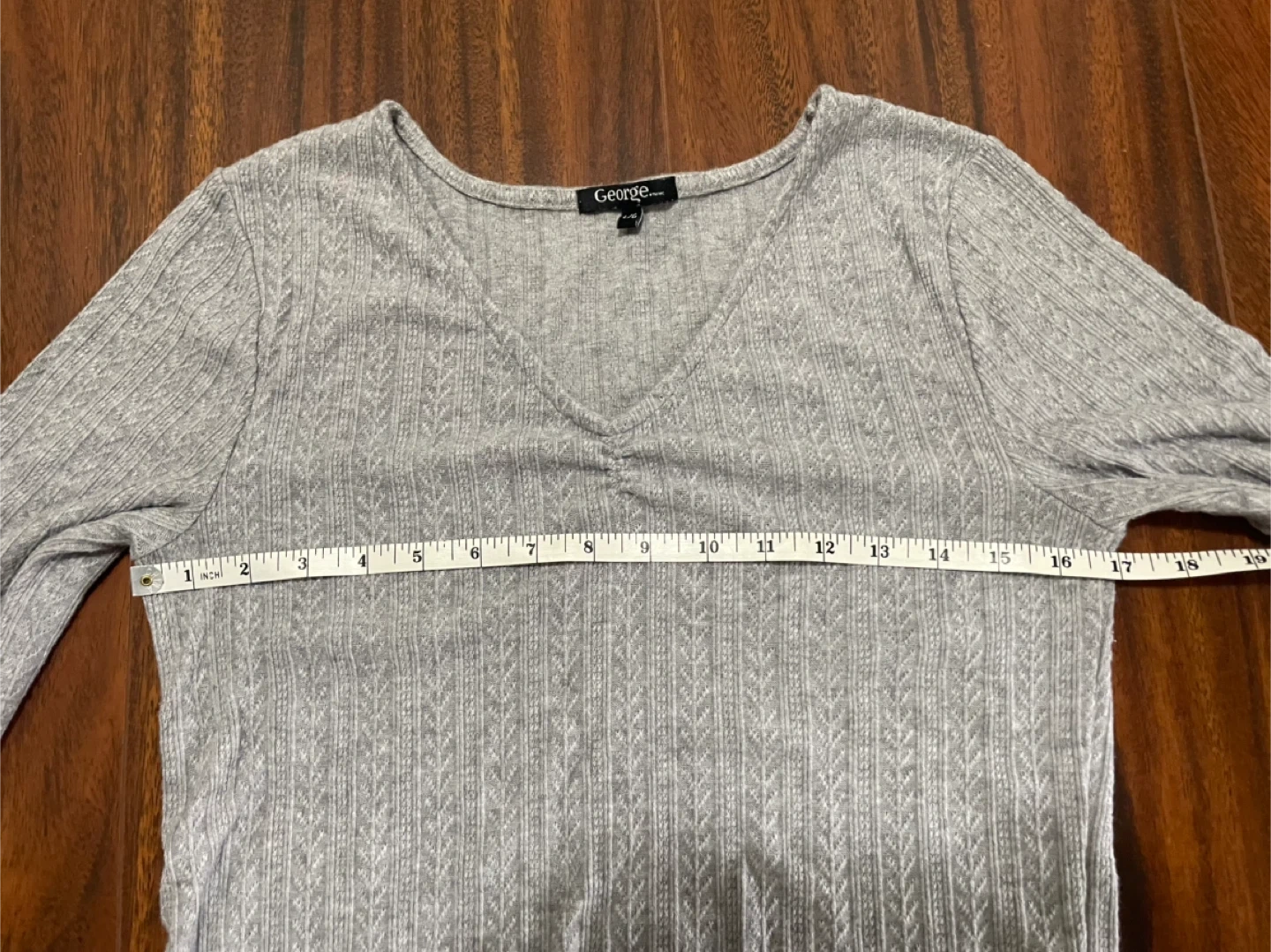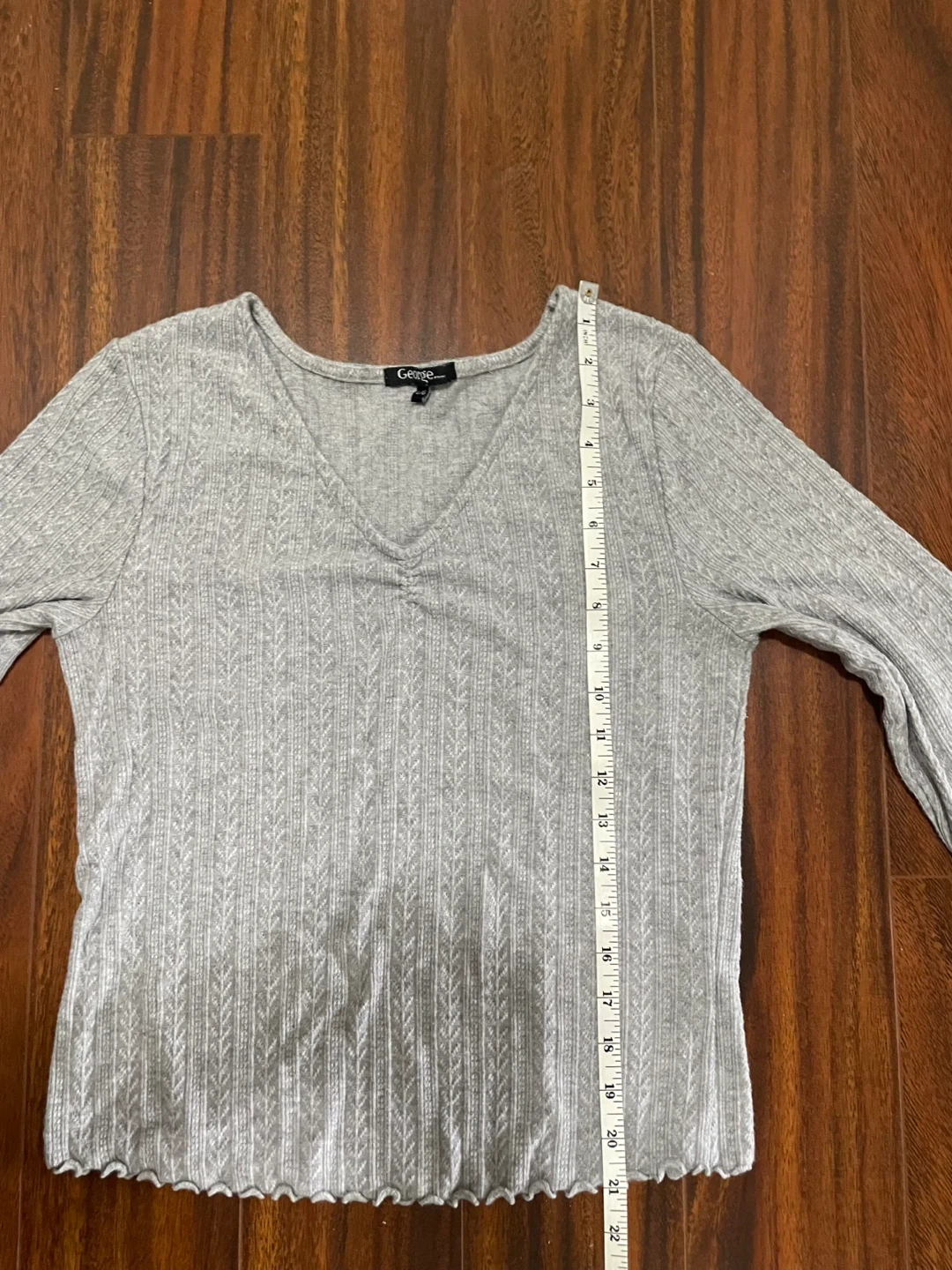 George long sleeve top in grey with textured stretch fabric. Ruched v neckline and lettuce edge trim at cuffs and hem. Fitted style. Excellent condition.