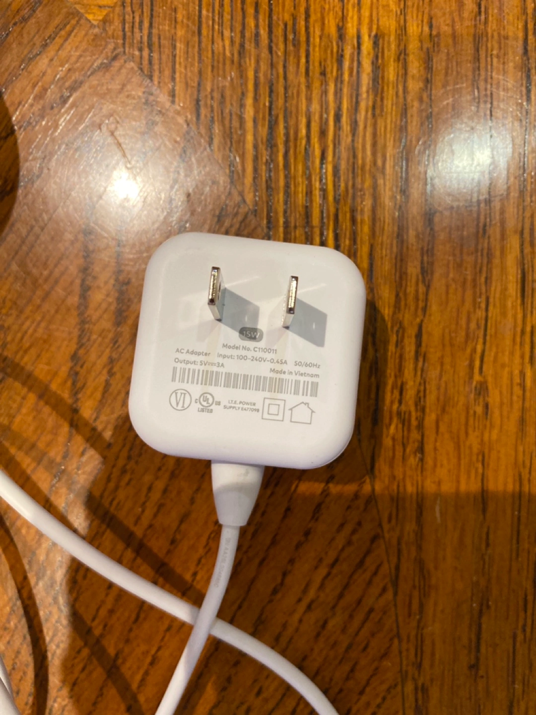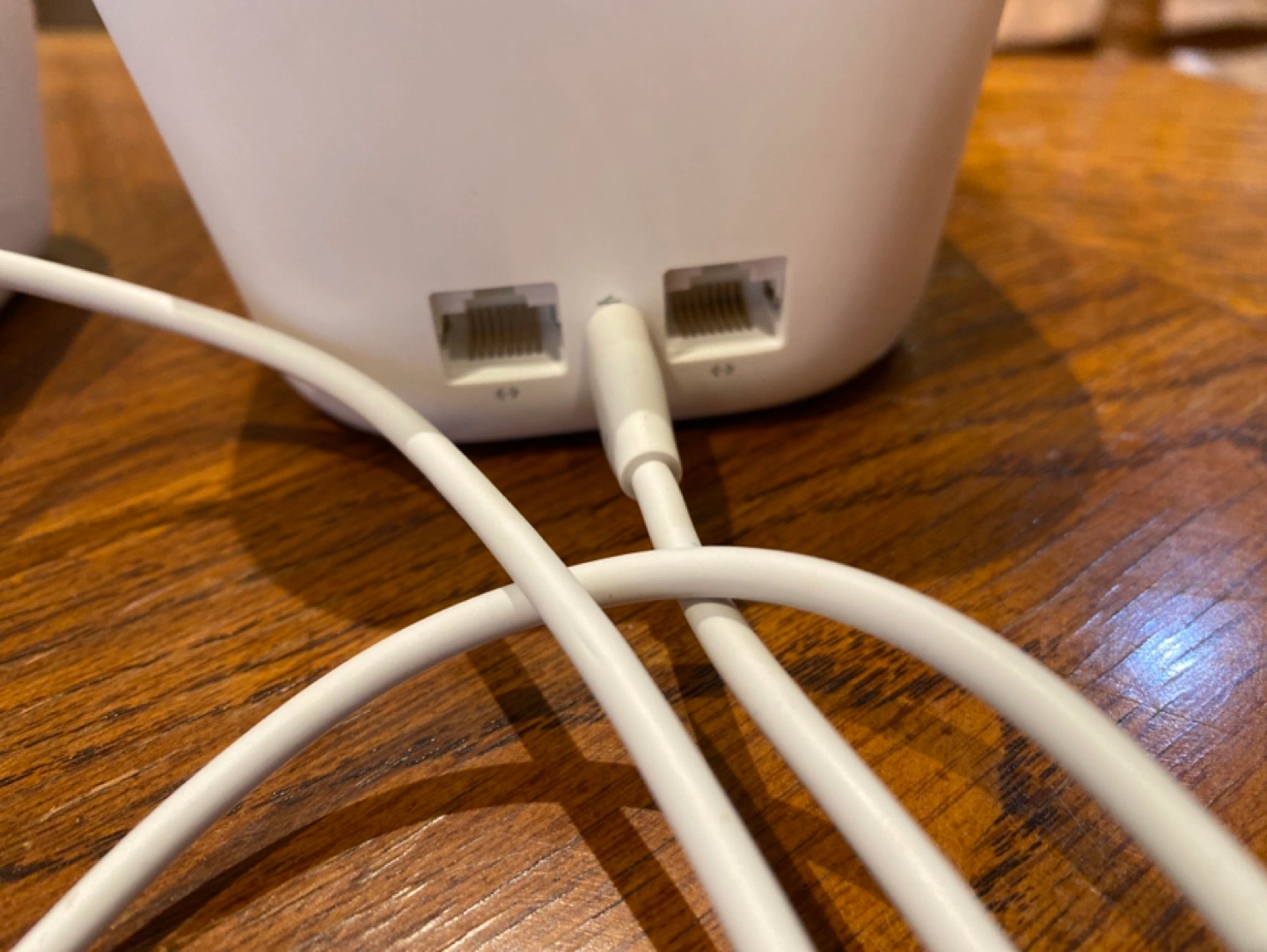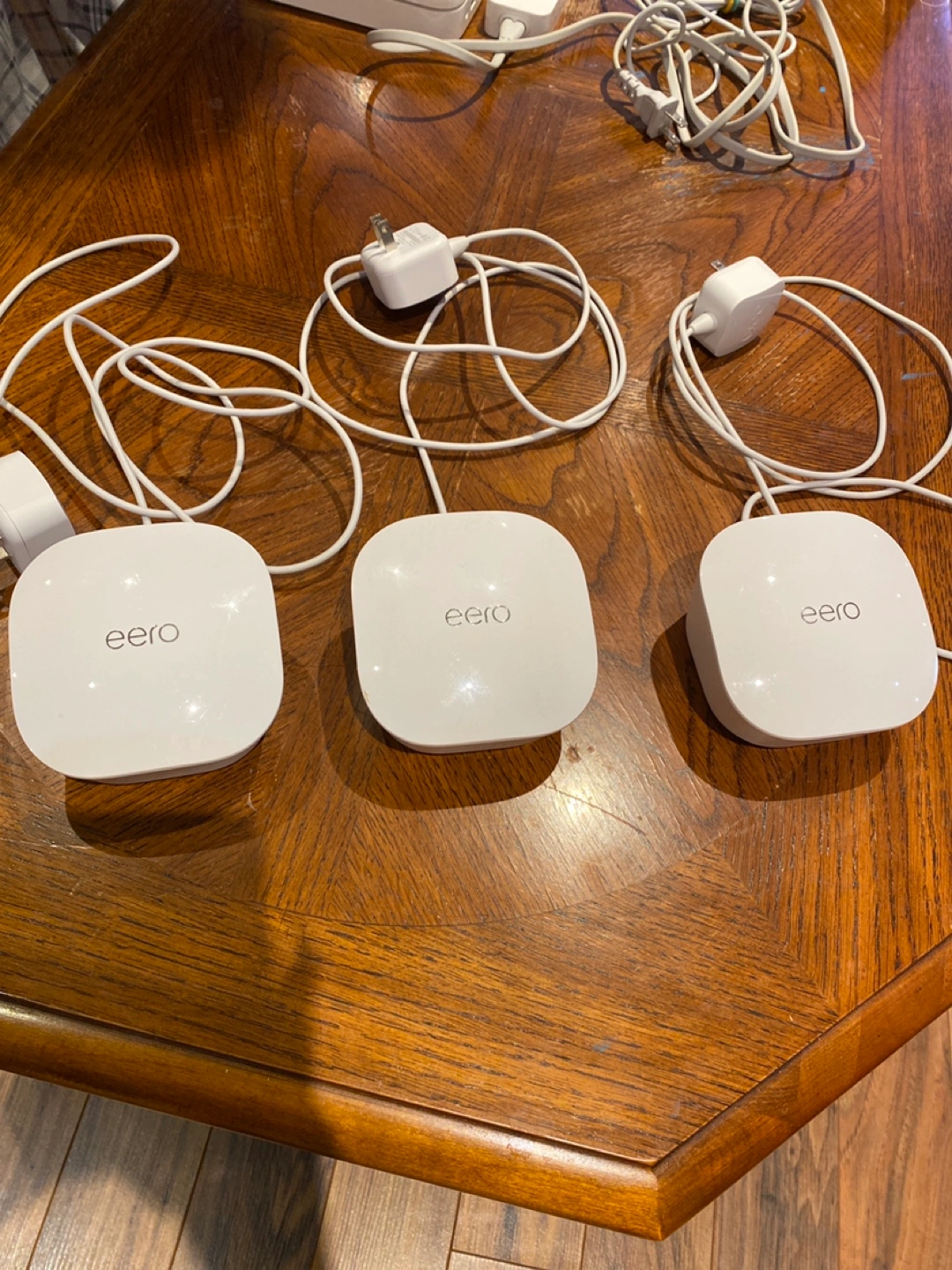 Three white eero Wifi mesh extenders. Includes power adapters. Ethernet ports on back.