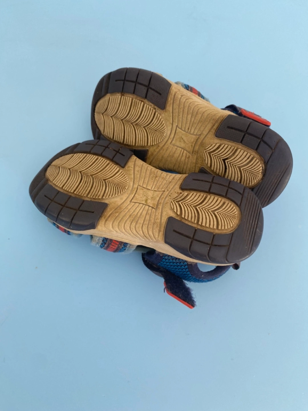 These are kids sport sandals in blue and red. They're designed for active outdoor wear. The soles offer good traction for various surfaces.