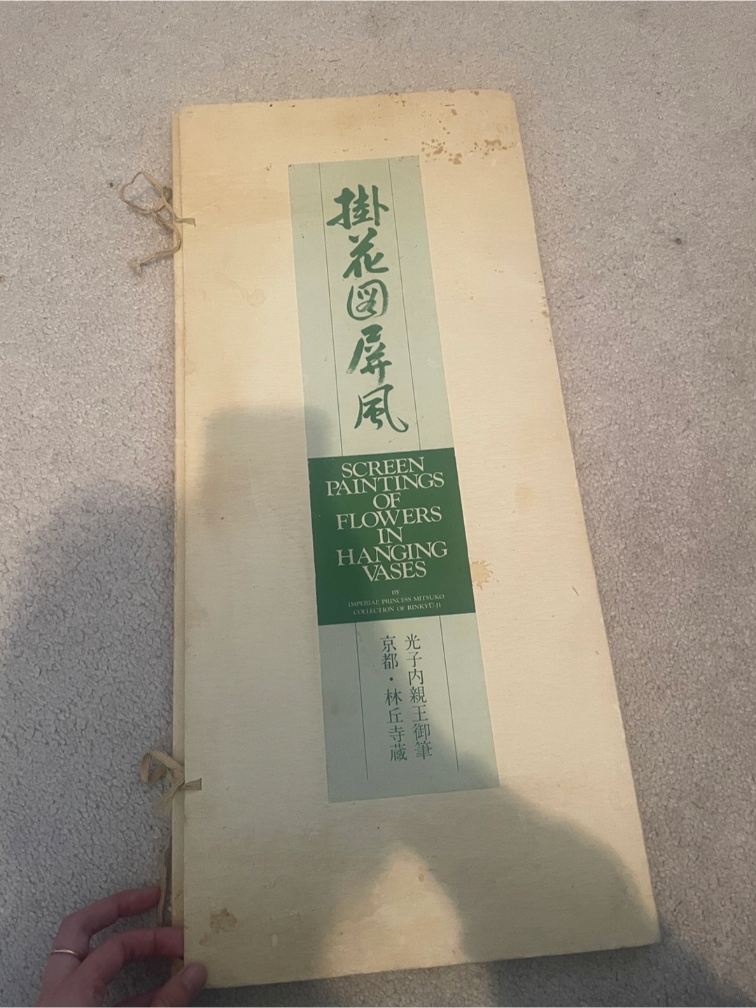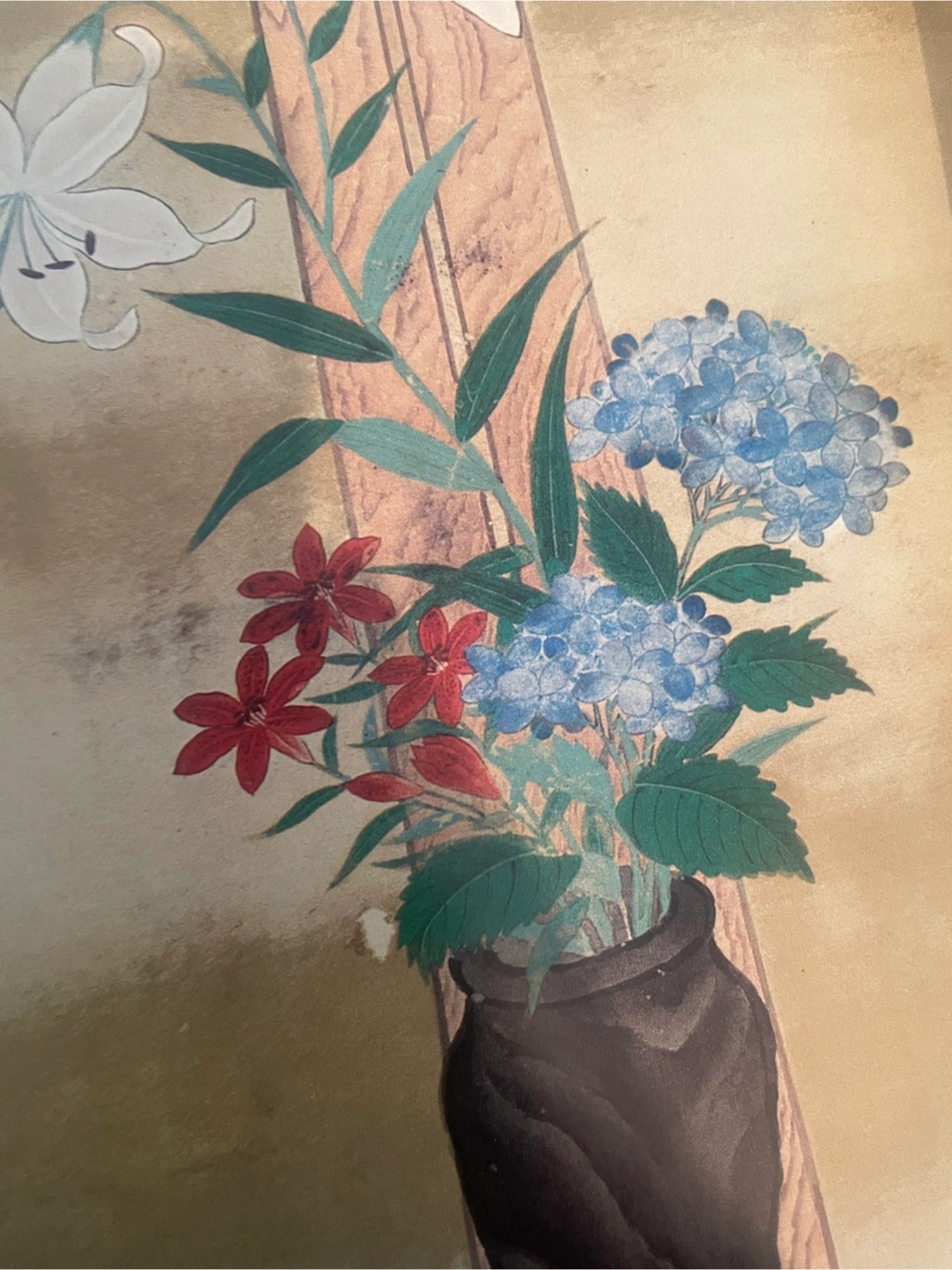 This is a collection of screen paintings featuring flowers in hanging vases. The images showcase lilies, hydrangeas, and other blossoms in a dark vase against a wood-like background. The artwork has a traditional Japanese aesthetic.