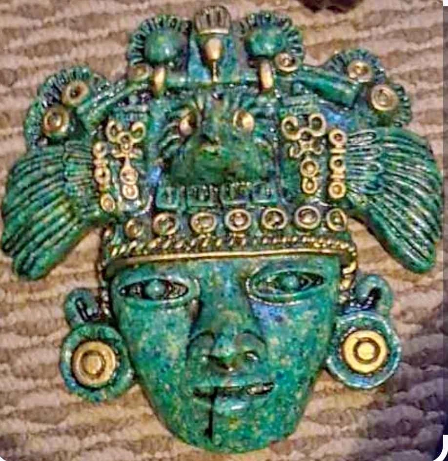Excellent condition mid last century Mesoamerican deity and/or warrior face mask. Hand made from crushed malachite, this is a Mexican Mayan/Aztec styled face mask plaque created approximately during the 1950s. Selling for $75. Rare and in exquisite condition. Be aware the Mayan priestess from whom I acquired this item warned that the item was haunted, and that by looking too deeply into its eyes one would see the past, perhaps never to return.