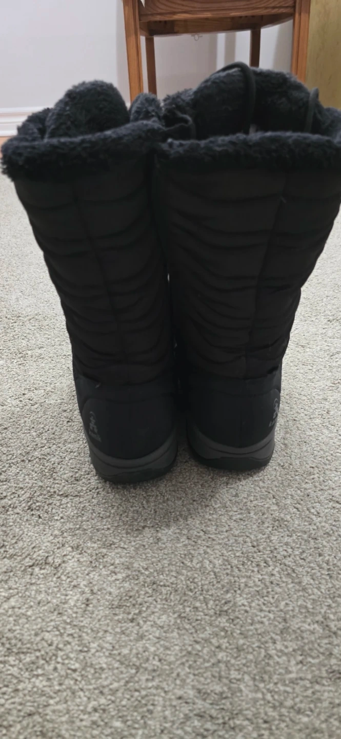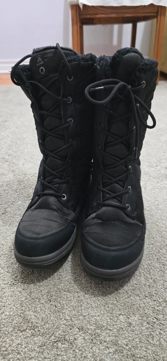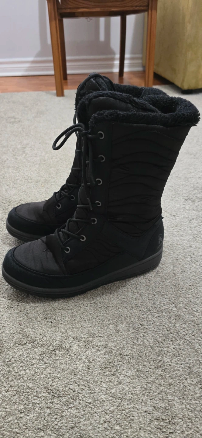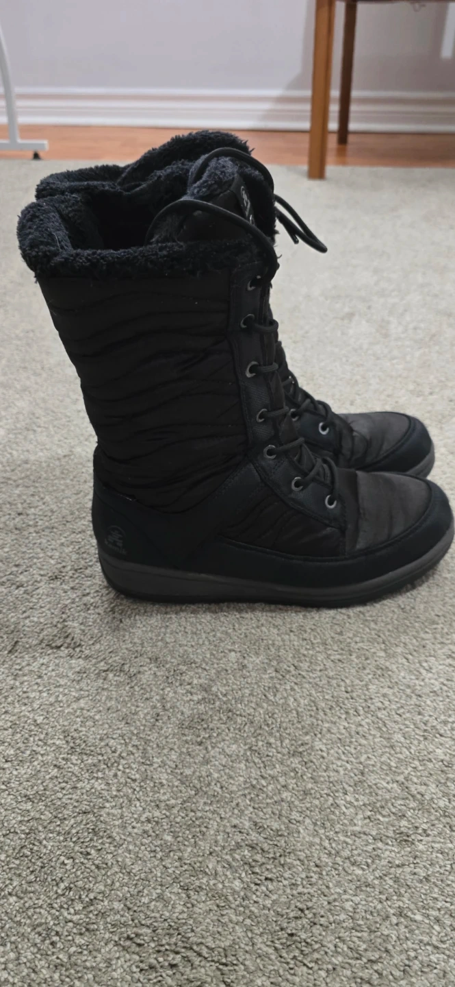 Kamik black winter boots with lace-up closure and faux fur lining. These boots are insulated for warmth and feature a durable tread for traction. Perfect for cold weather and snowy conditions!