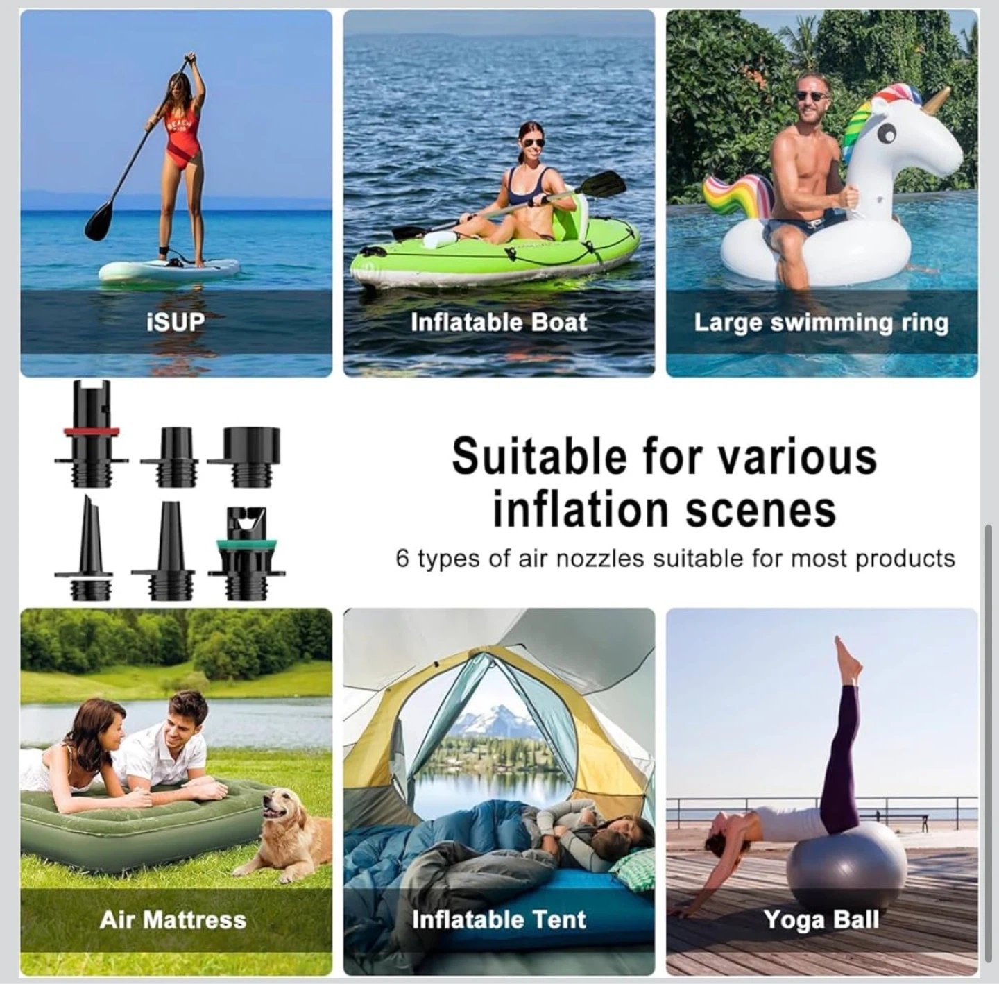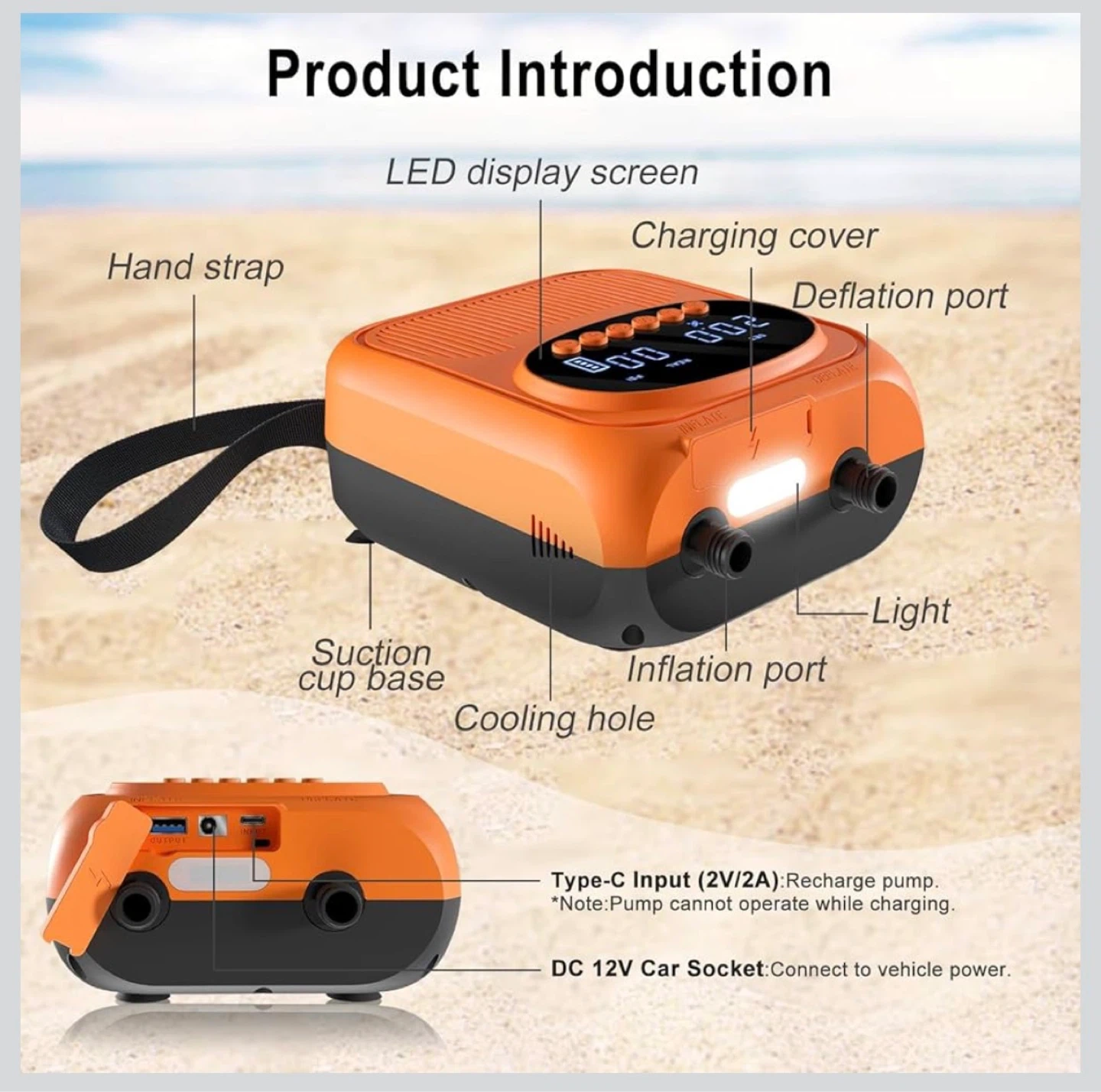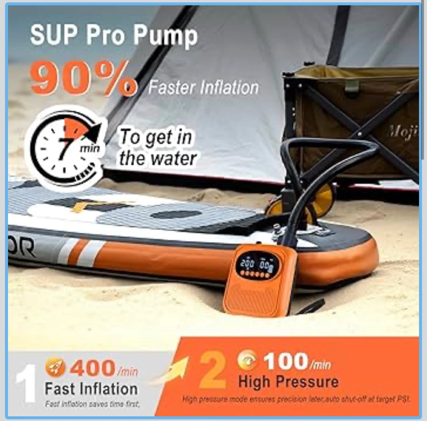 This Mojimdo SUP Pro Pump is rechargeable and offers up to 20PSI with auto shut-off. It features 400 L/min fast inflation and 100 L/min high pressure modes. It's detachable, Type-C, and 12V DC compatible, suitable for stand-up paddleboards and kayaks.