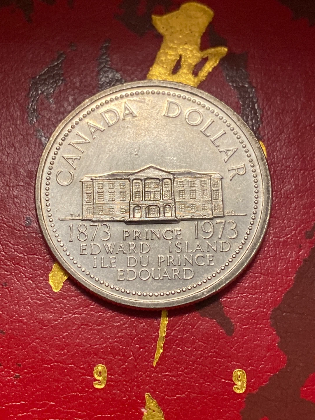 Commemorative Canadian dollar coin from 1973 celebrating the centennial of Prince Edward Island. Features the Confederation Building on one side and Queen Elizabeth II on the other. Struck in Canada.