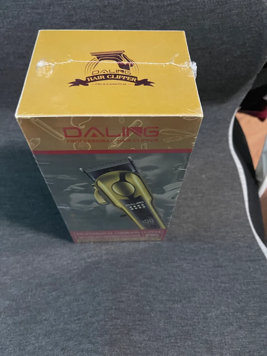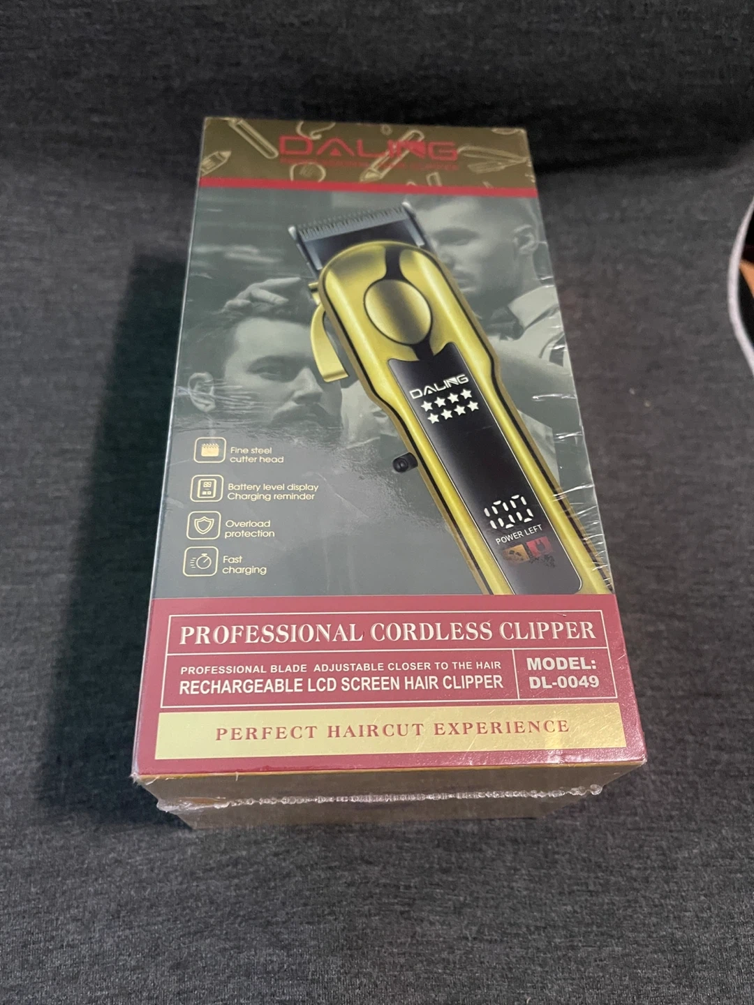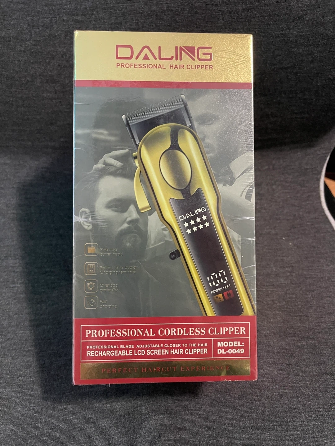This is a Daling Professional Cordless Hair Clipper. It features a fine steel cutter head and an adjustable blade. It has a rechargeable battery with an LCD screen displaying power left. Charging time is 3.5 hours and runtime is 240 minutes.