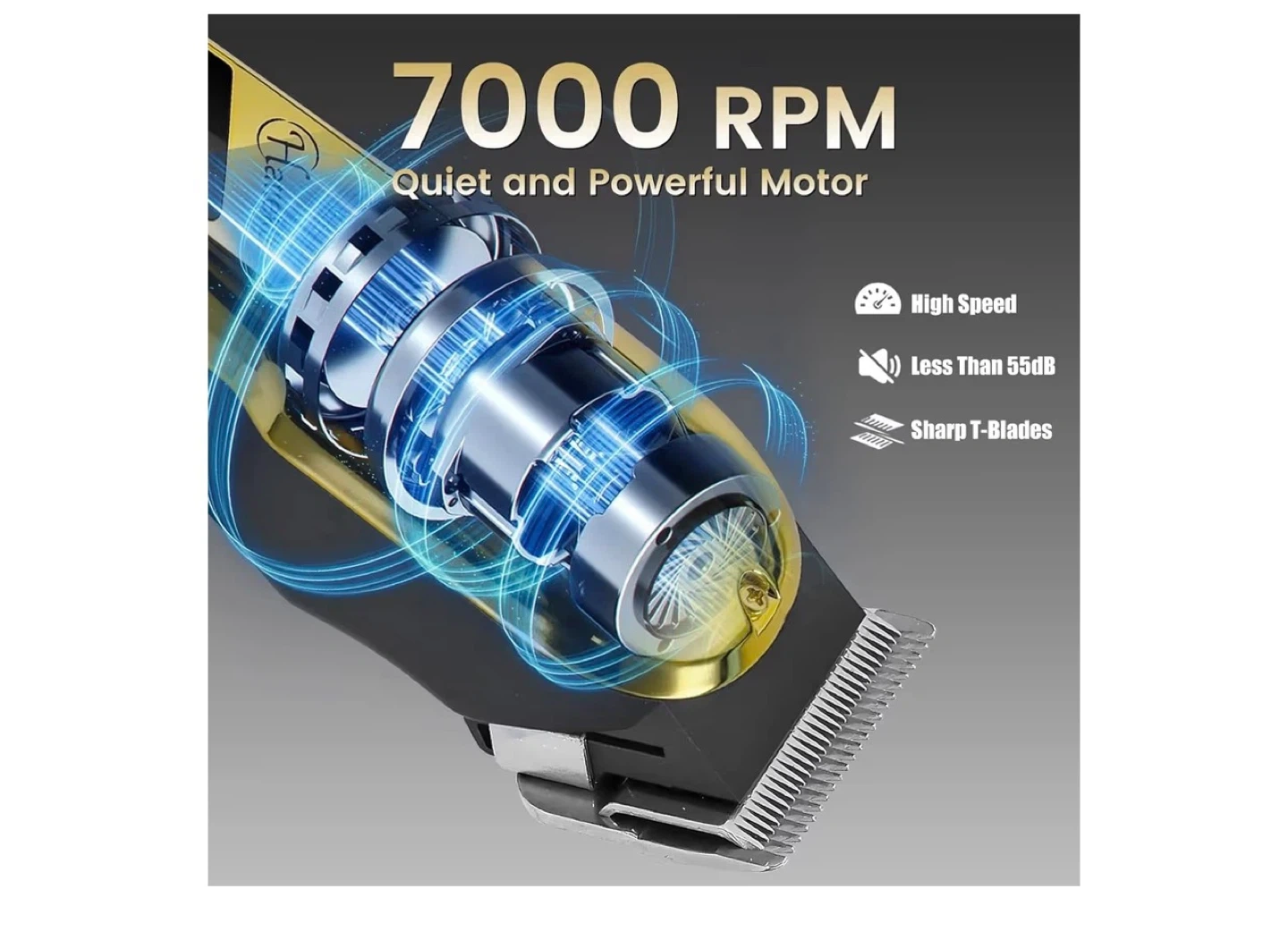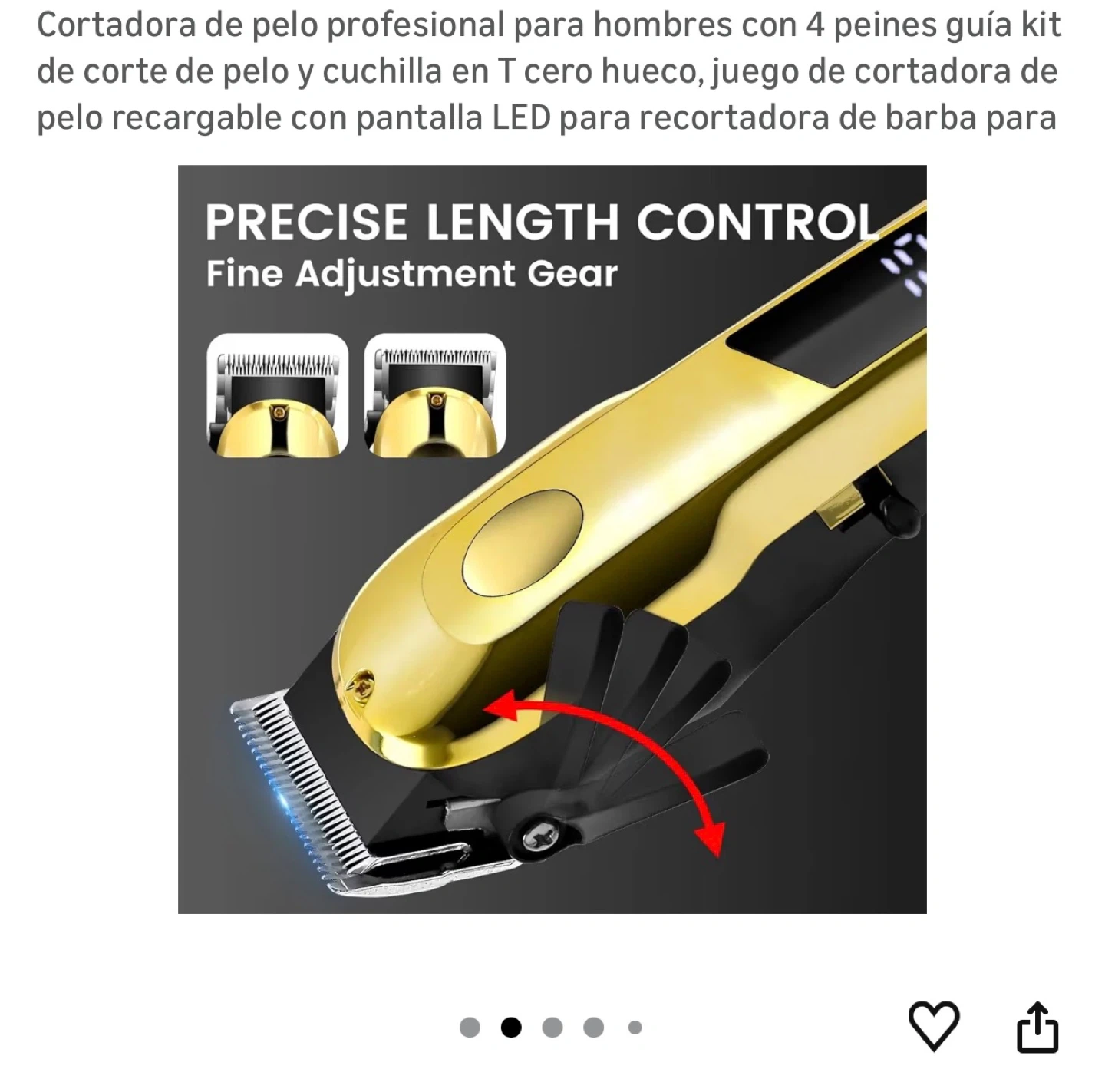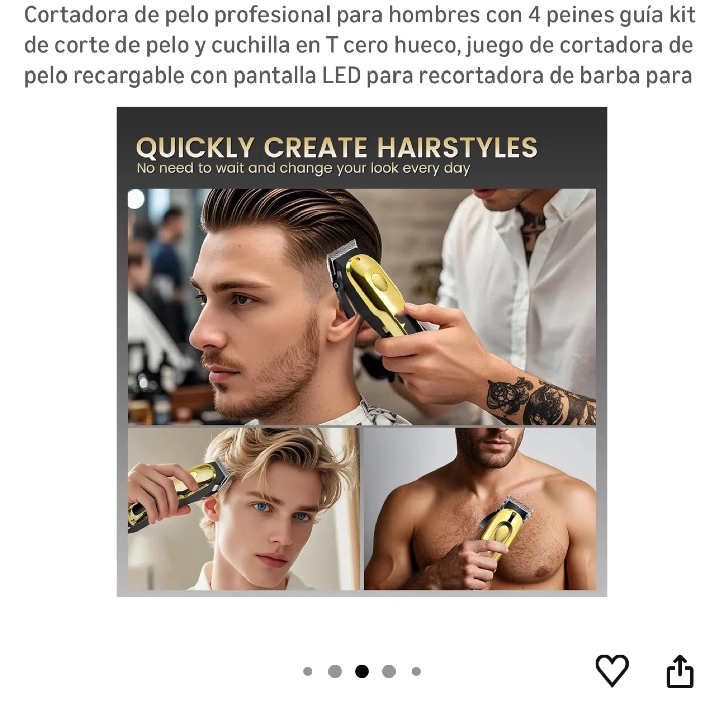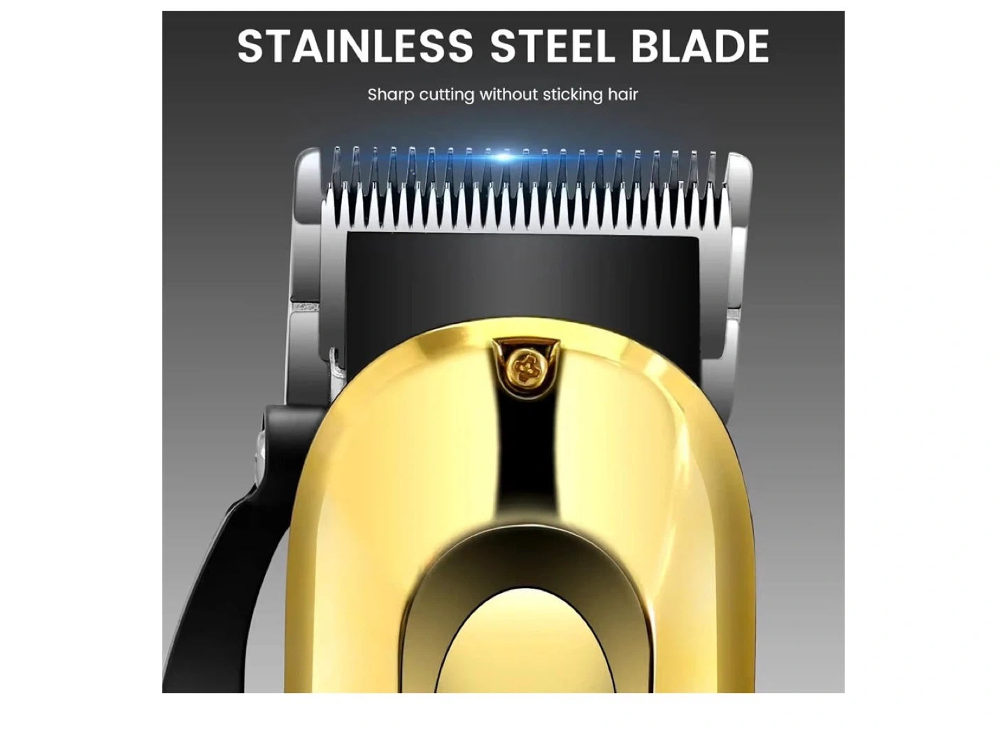 This is a Daling Professional Cordless Hair Clipper. It features a fine steel cutter head and an adjustable blade. It has a rechargeable battery with an LCD screen displaying power left. Charging time is 3.5 hours and runtime is 240 minutes.