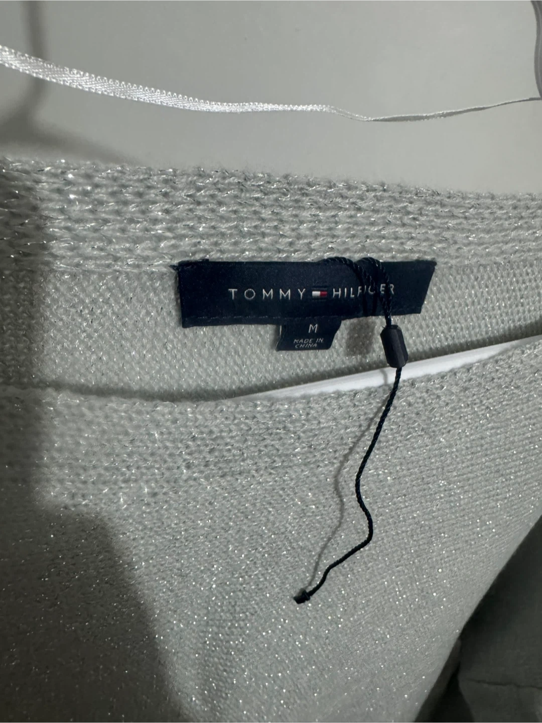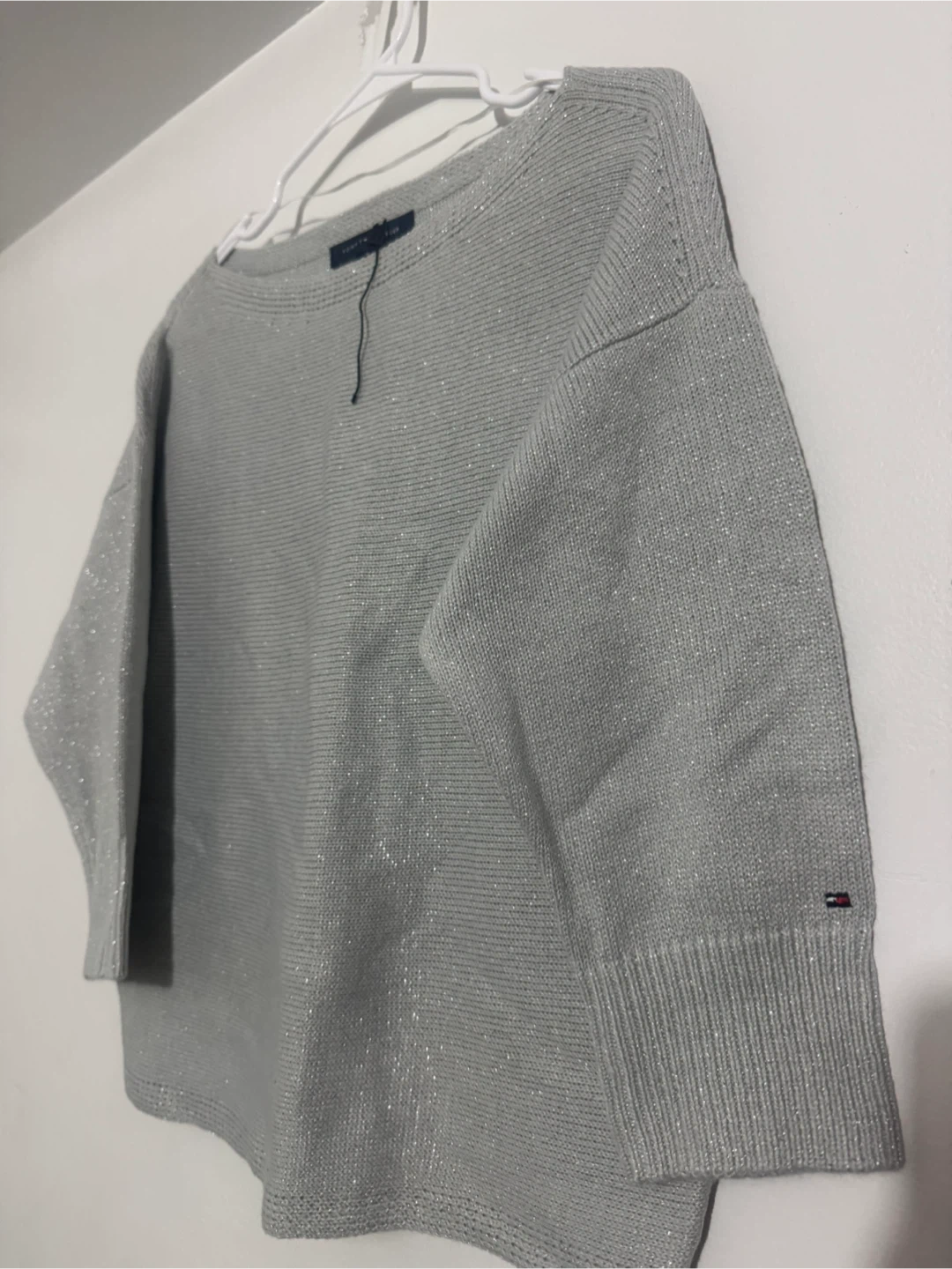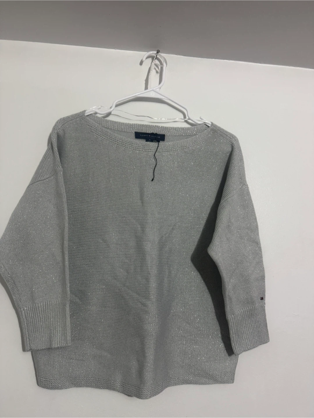 Tommy Hilfiger women's sweater in a shimmering silver knit. It's a size medium with 3/4 length sleeves. This top has a boat neckline and a ribbed hem. It's a stylish piece for dressing up an outfit! $10