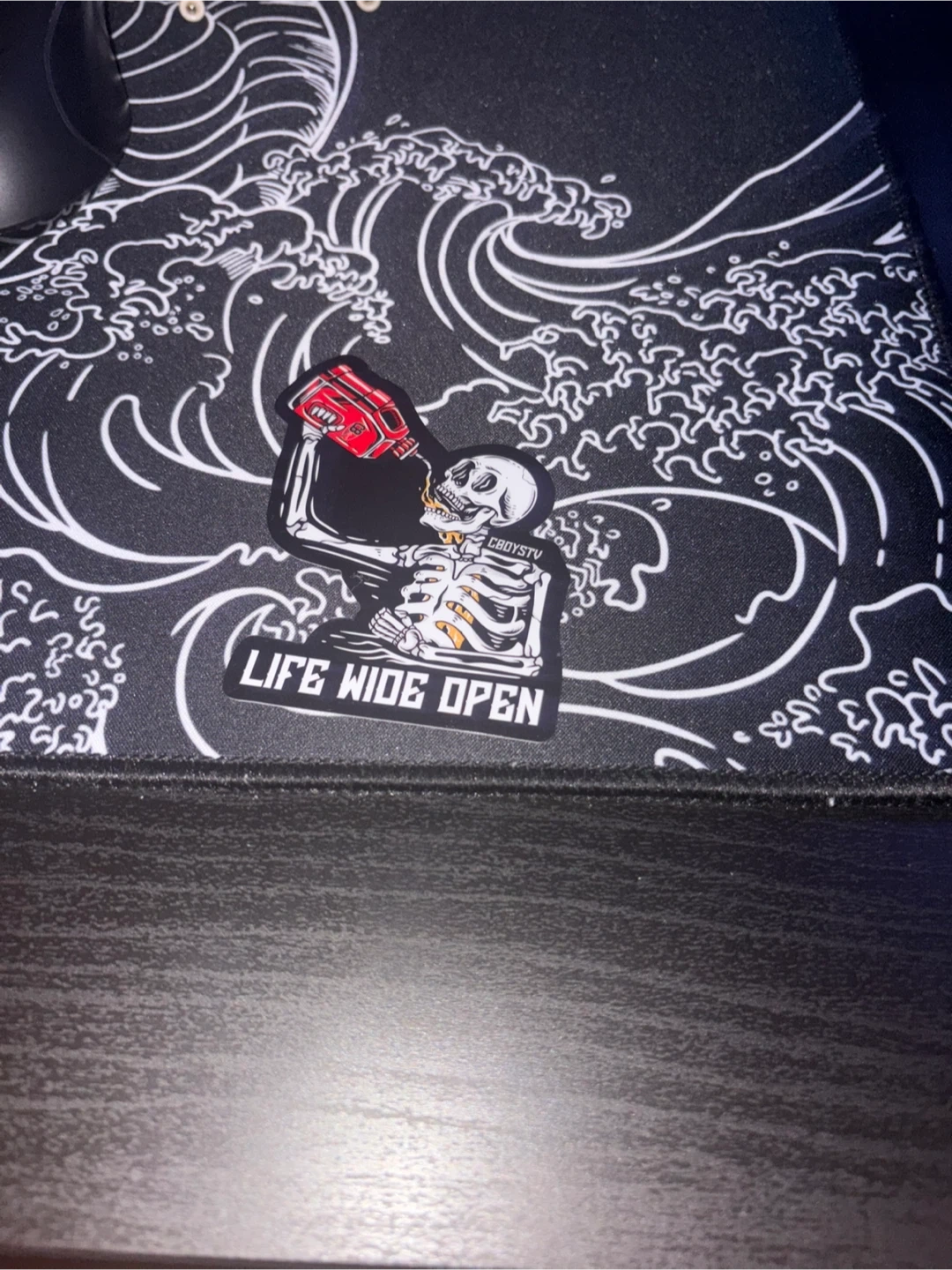 This sticker features a skeleton drinking from a red gas can with "LIFE WIDE OPEN" text. It's a fun sticker with a unique design. Measures approximately 3x3 inches.